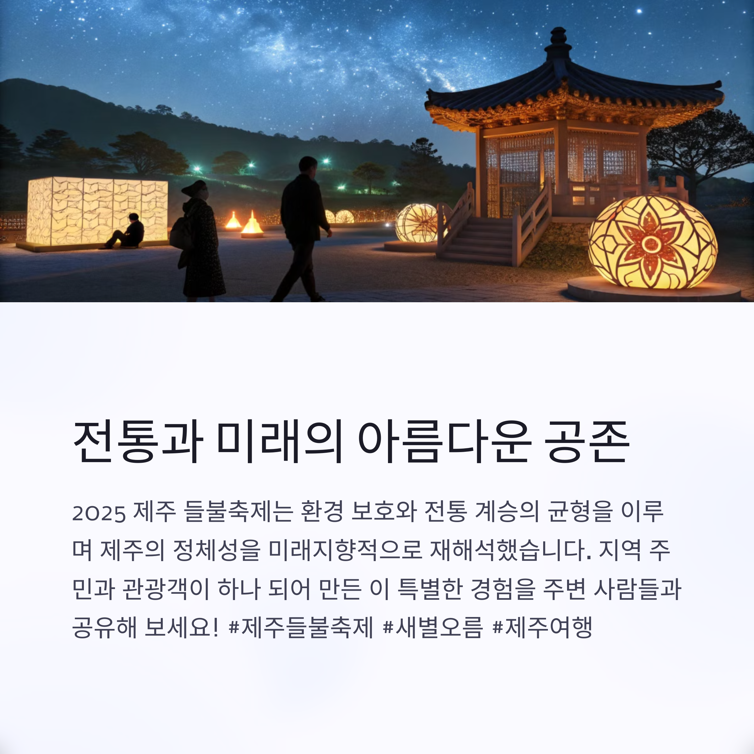 매년 봄, 제주에서는 특별한 문화 축제가 열립니다. 2025년에도 어김없이 개최된 제주들불축제는 새로운 형식과 콘텐츠로 많은 사람들의 발길을 끌었습니다. 특히 새별오름에서 열린 이 축제는 전통의 멋과 디지털 기술이 어우러져 또 다른 감동을 선사했는데요. 자연과 예술이 어우러진 축제의 풍경은 일상에 지친 마음을 따뜻하게 감싸줍니다. 제주를 찾는 많은 이들이 이 축제를 찾는 이유는 분명합니다. 자연 속에서 누리는 여유, 그리고 눈앞에서 펼쳐지는 빛과 소리의 향연이 그 이유 중 하나일 것입니다. 오늘은 직접 다녀온 2025 제주들불축제 후기를 생생한 사진과 함께 소개드리며, 여러분께 특별한 여행 정보를 전해드리고자 합니다. 봄 제주 여행을 계획하시는 분들께 조금이나마 도움이 되기를 바랍니다.