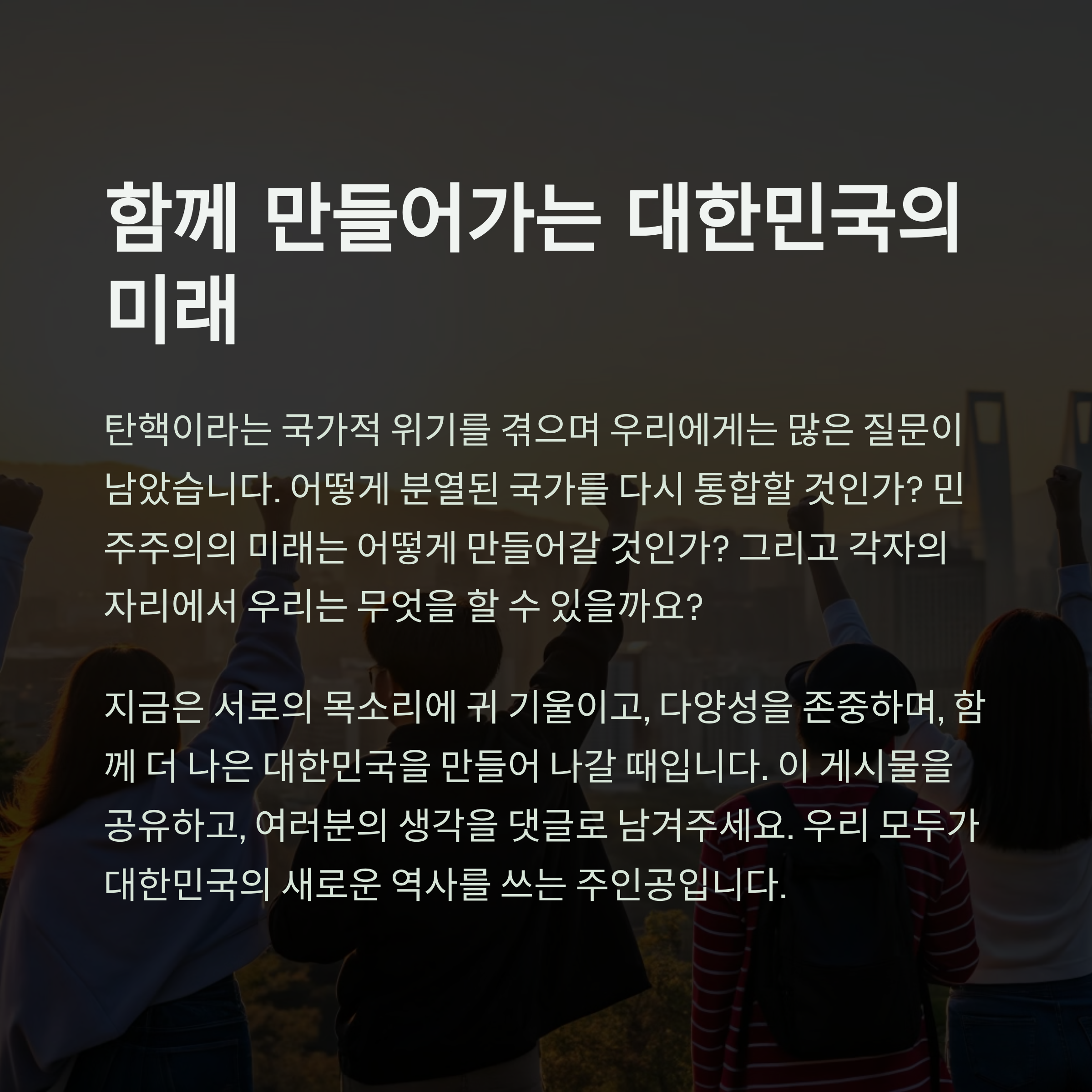 함께 힘을 모아 이 변화의 파도를 슬기롭게 타고 넘어갑시다. 대한민국의 밝은 미래, 우리 손으로 만들어 갑시다!