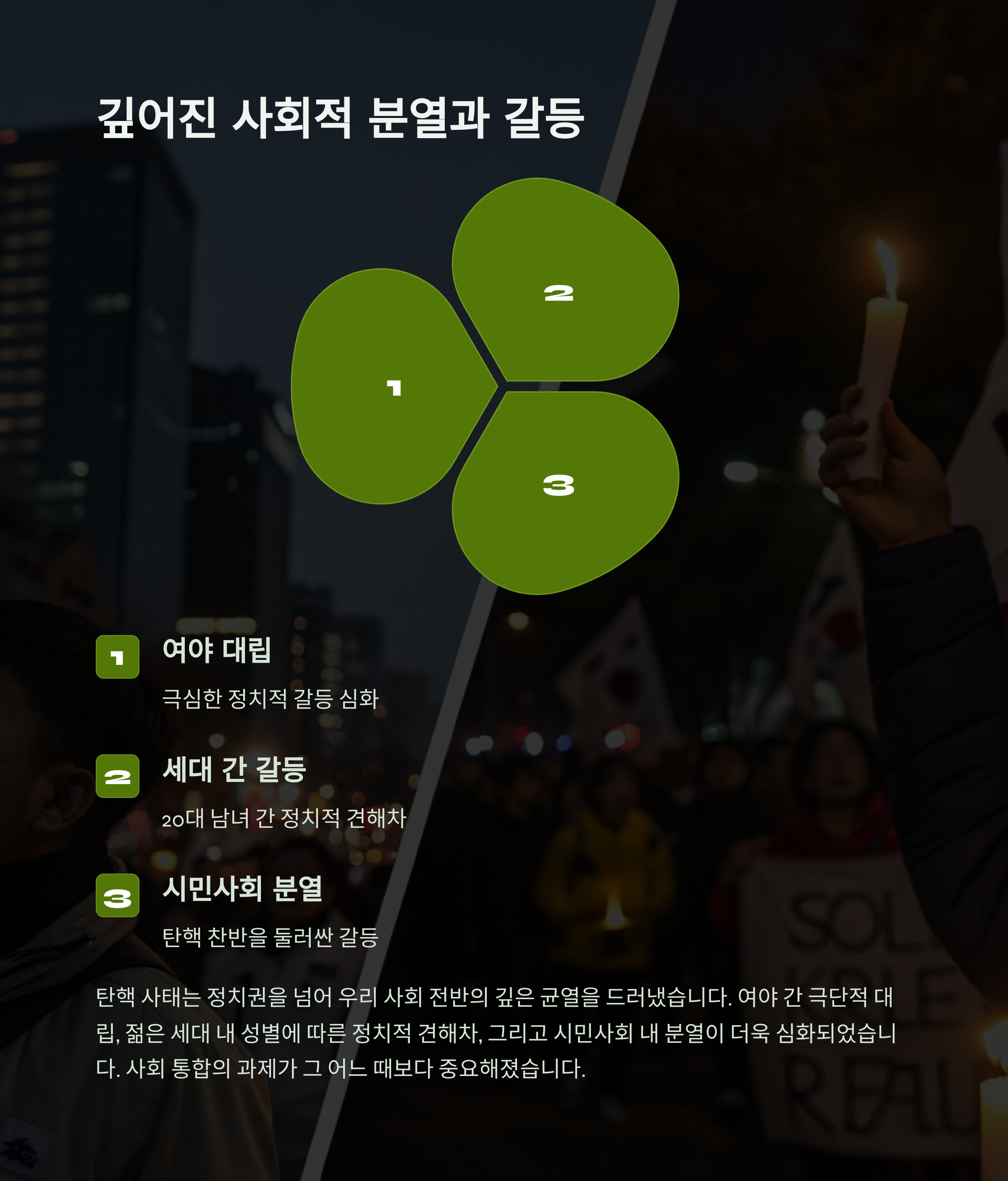 탄핵 정국을 거치며 우리 사회의 갈등은 더욱 깊어졌습니다. 이를 해소하고 사회를 통합하는 것이 시급한 과제로 떠올랐어요.