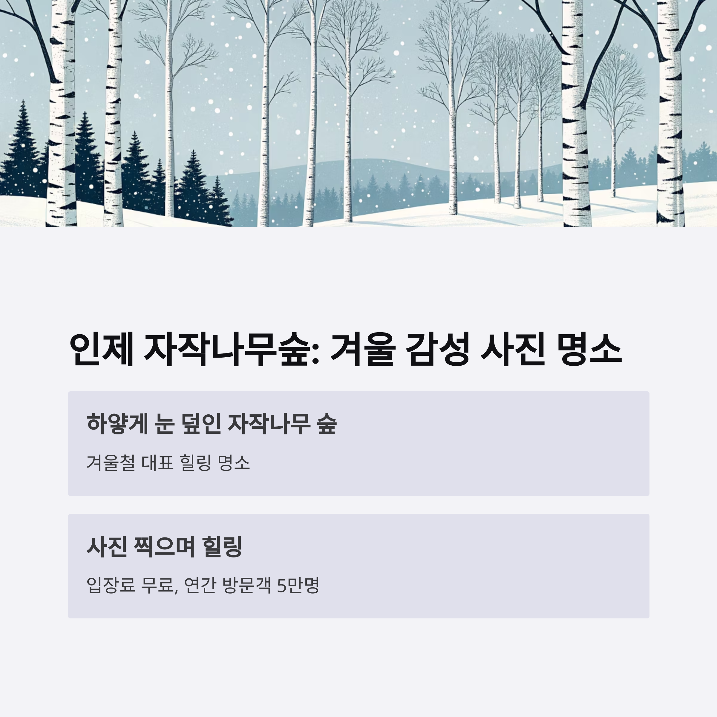 하얗게 눈 덮인 자작나무 숲은 겨울철 대표 힐링 명소로 손꼽힙니다. 입장료는 없으며, 주변 스키장 이용 시 추가 비용이 발생할 수 있습니다.