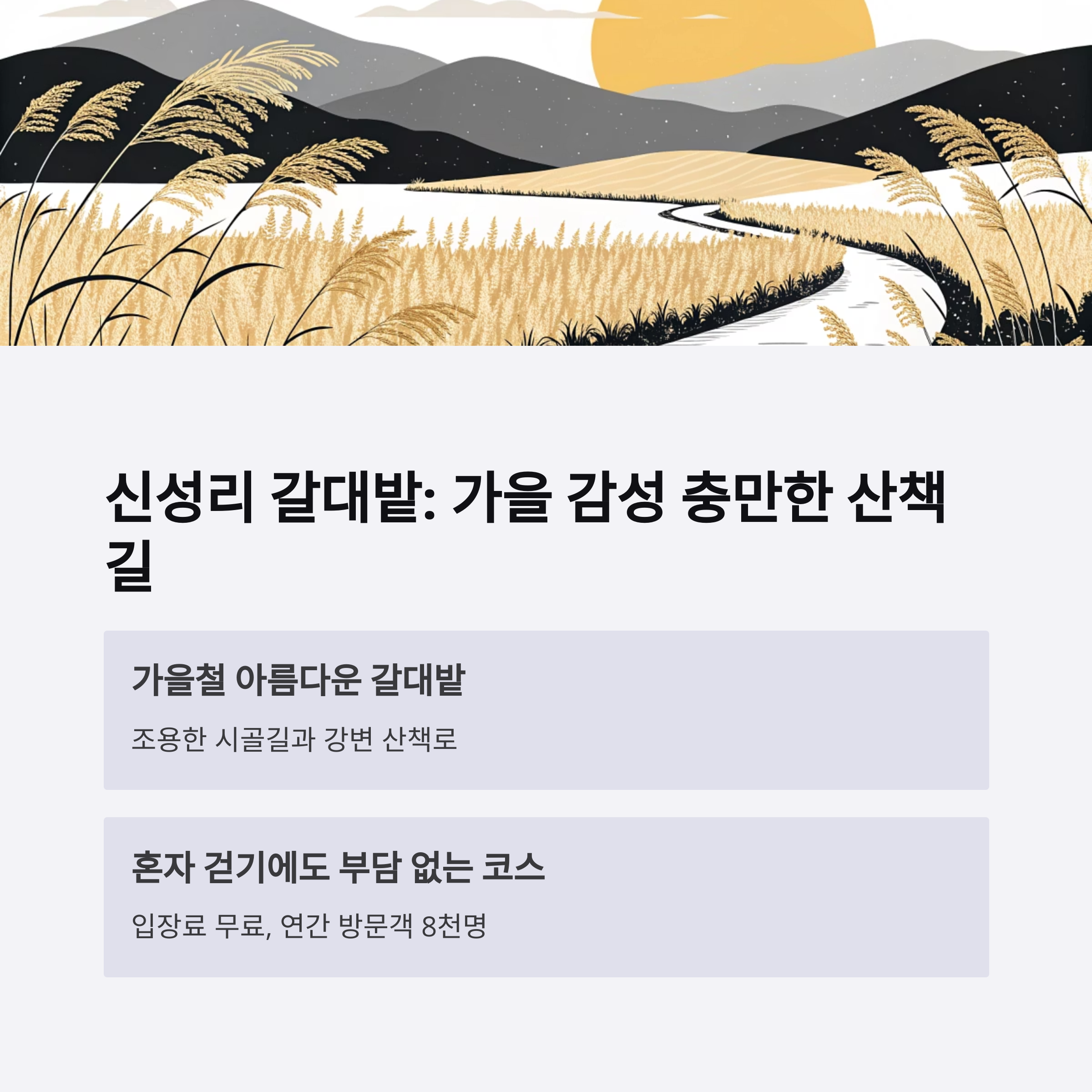 충남 서천에 위치한 갈대밭은 가을철에 특히 아름답습니다. 조용한 시골길과 강변 산책로는 혼자 걷기에도 부담 없는 코스입니다.