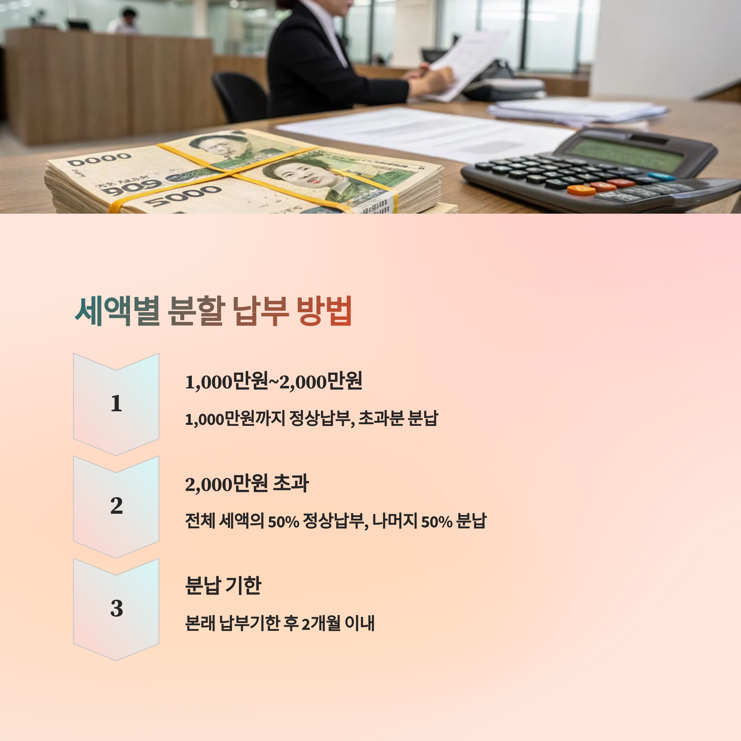 - 2,000만 원 초과인 경우: 전체 세액의 50% 기한 내 납부, 나머지 50% 분납 가능