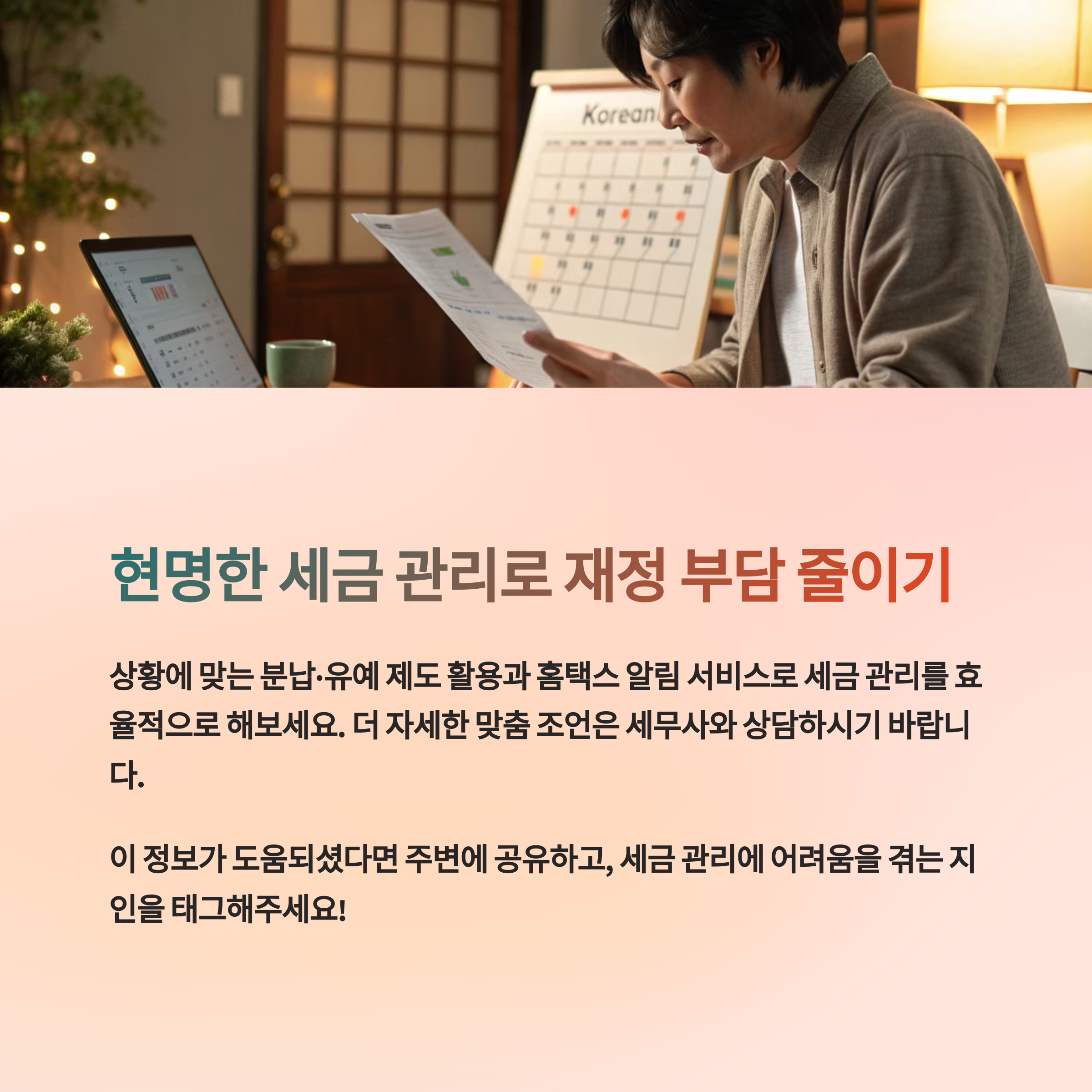 - 기한 엄수가 가장 중요합니다. 분납 기한을 넘기면 가산세가 부과됩니다.