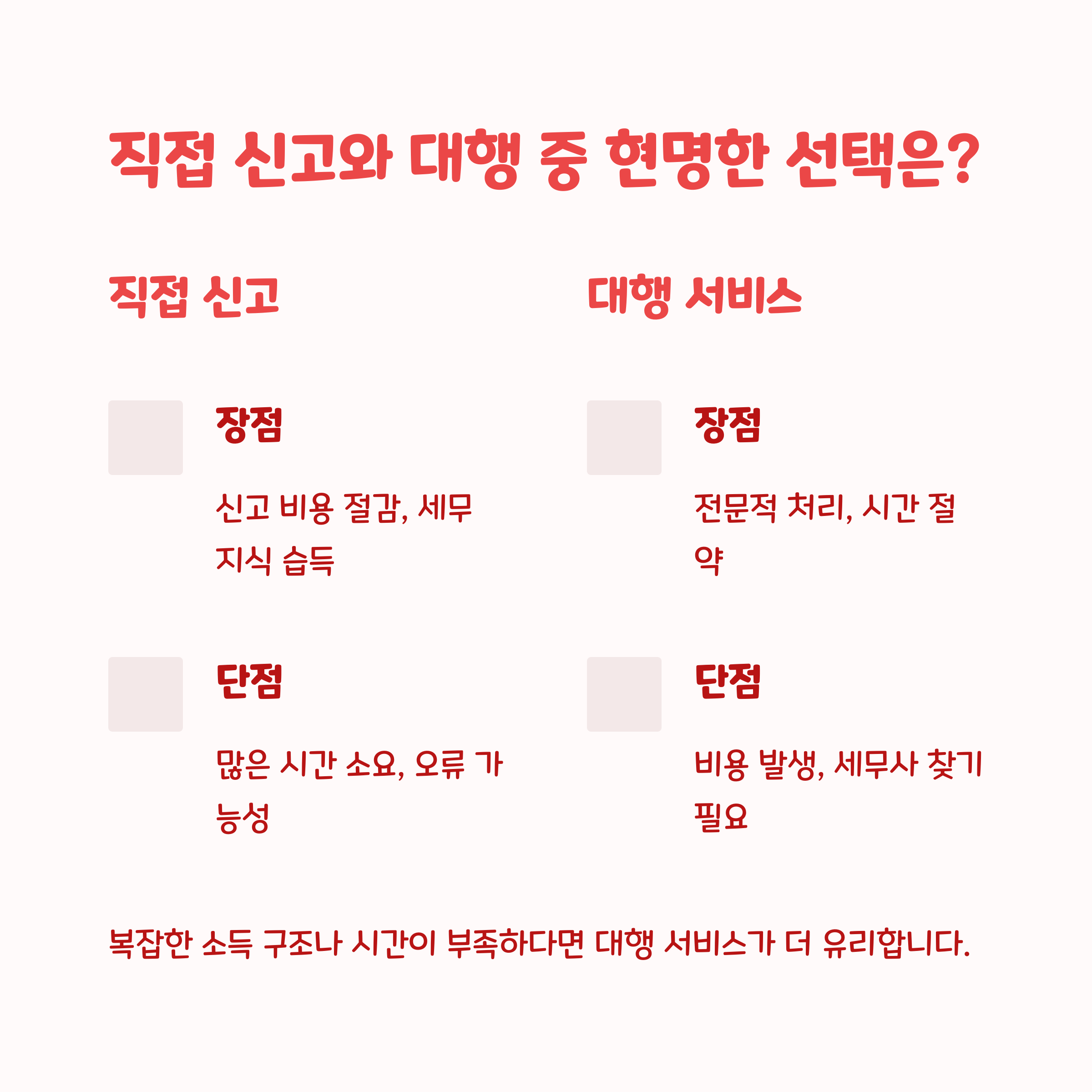 하지만 모든 사람에게 신고 대행이 필요한 것은 아닙니다. 소득 구조가 단순하고, 세금에 대한 기본 지식이 있다면 직접 신고하는 것도 충분히 가능합니다.