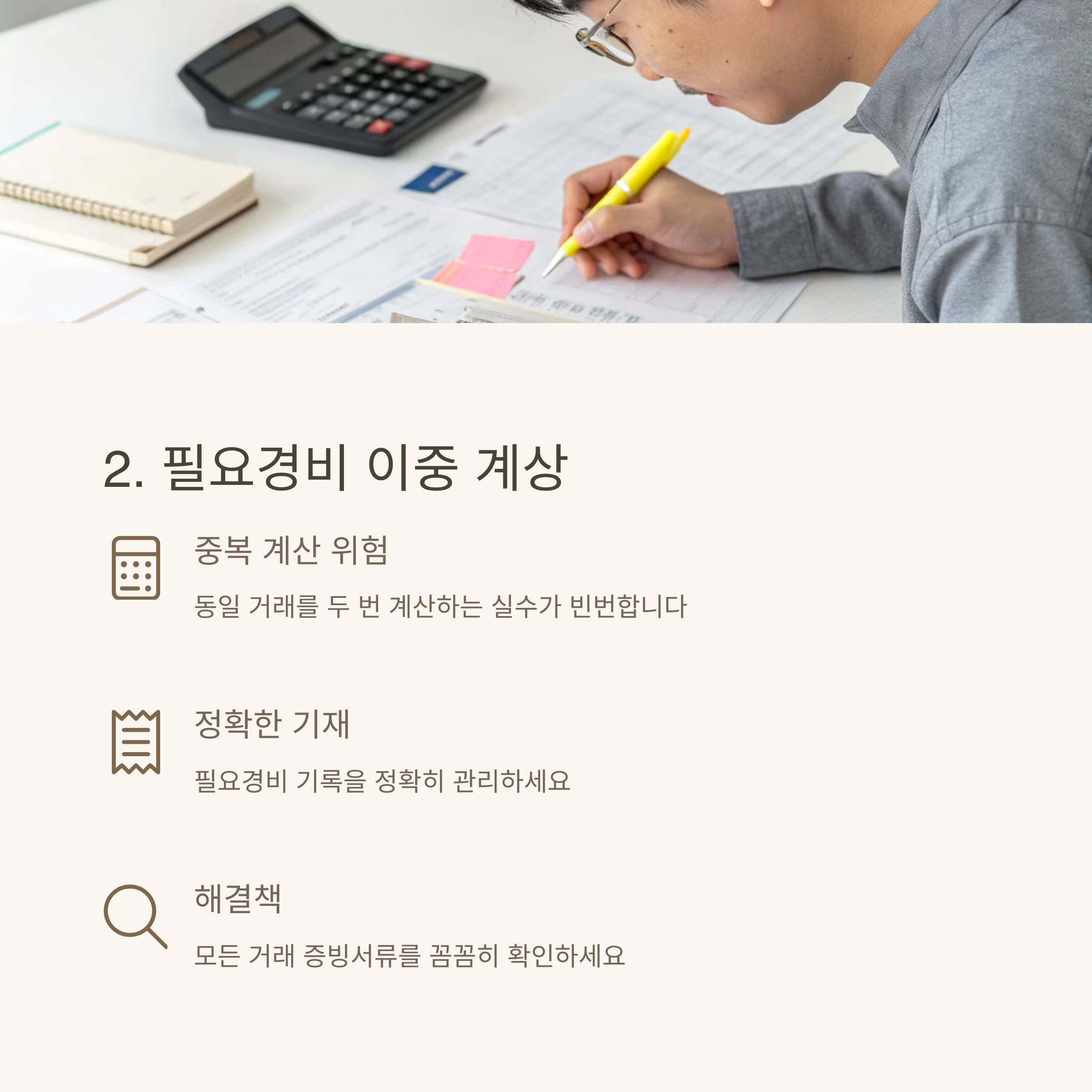 동일한 경비를 두 번 계상하는 실수는 국세청 사후분석에서 단골로 적발되는 사례입니다.
