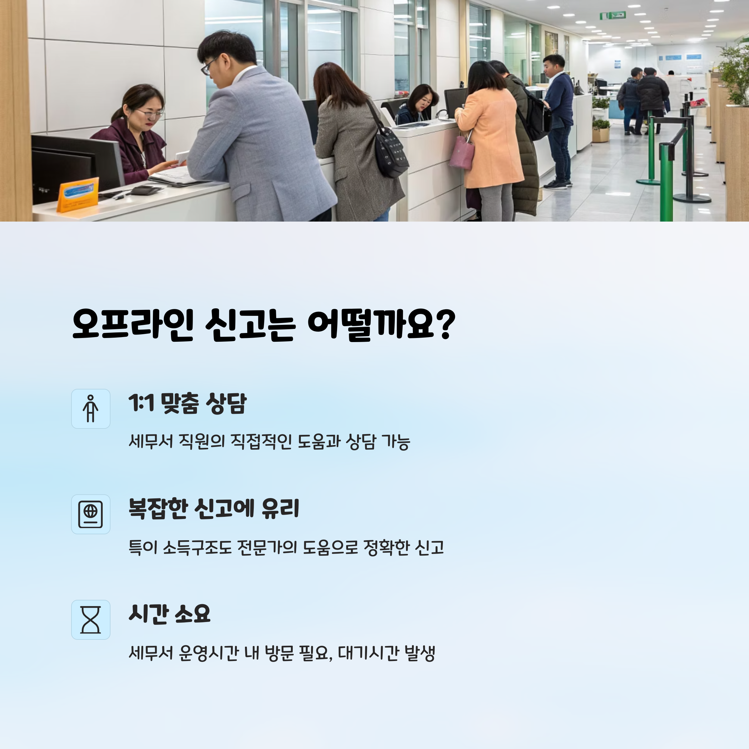 오프라인 신고는 세무서 직원의 도움을 받을 수 있어 복잡한 세금 문제 해결에 유리합니다.