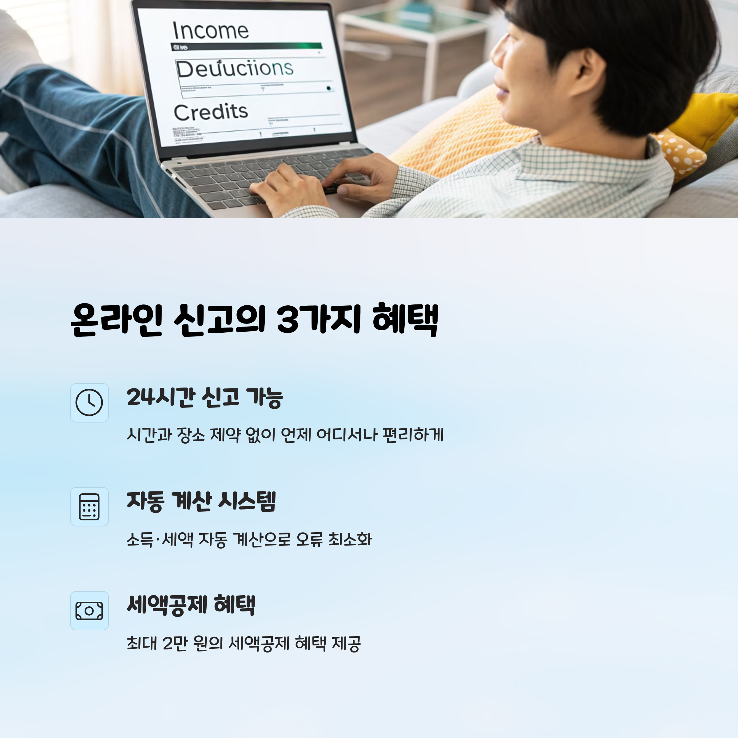 온라인 신고는 시간과 장소에 구애받지 않고 편리하게 이용할 수 있으며, 2025년부터는 홈택스가 더욱 사용하기 쉽게 개편되어 접근성이 높아졌습니다.