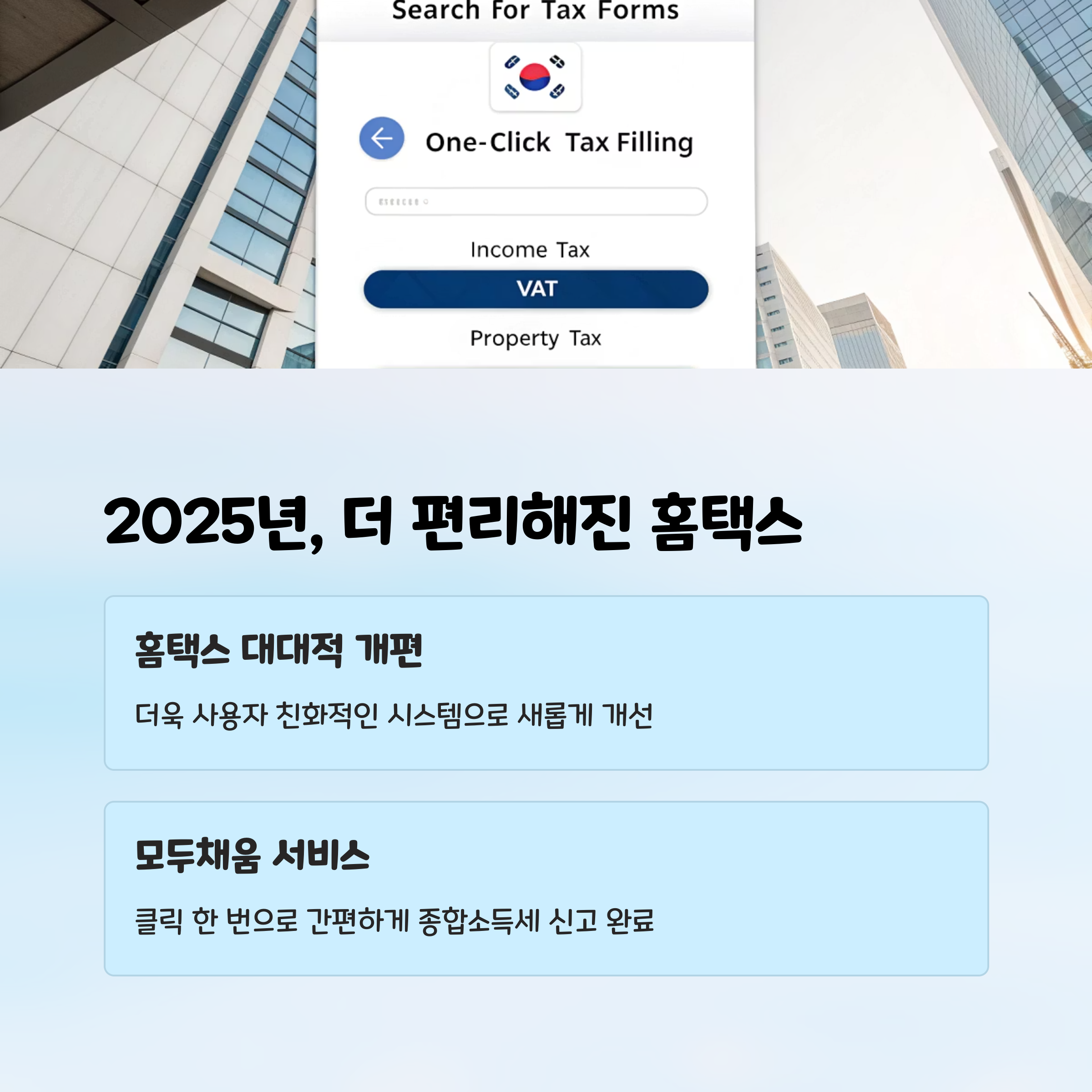 2025년에는 '모두채움 서비스'가 확대되어 더 많은 납세자가 간편하게 신고할 수 있게 되었습니다. 모두채움 서비스는 국세청이 보유한 정보를 바탕으로 신고서를 미리 작성해주는 서비스입니다.