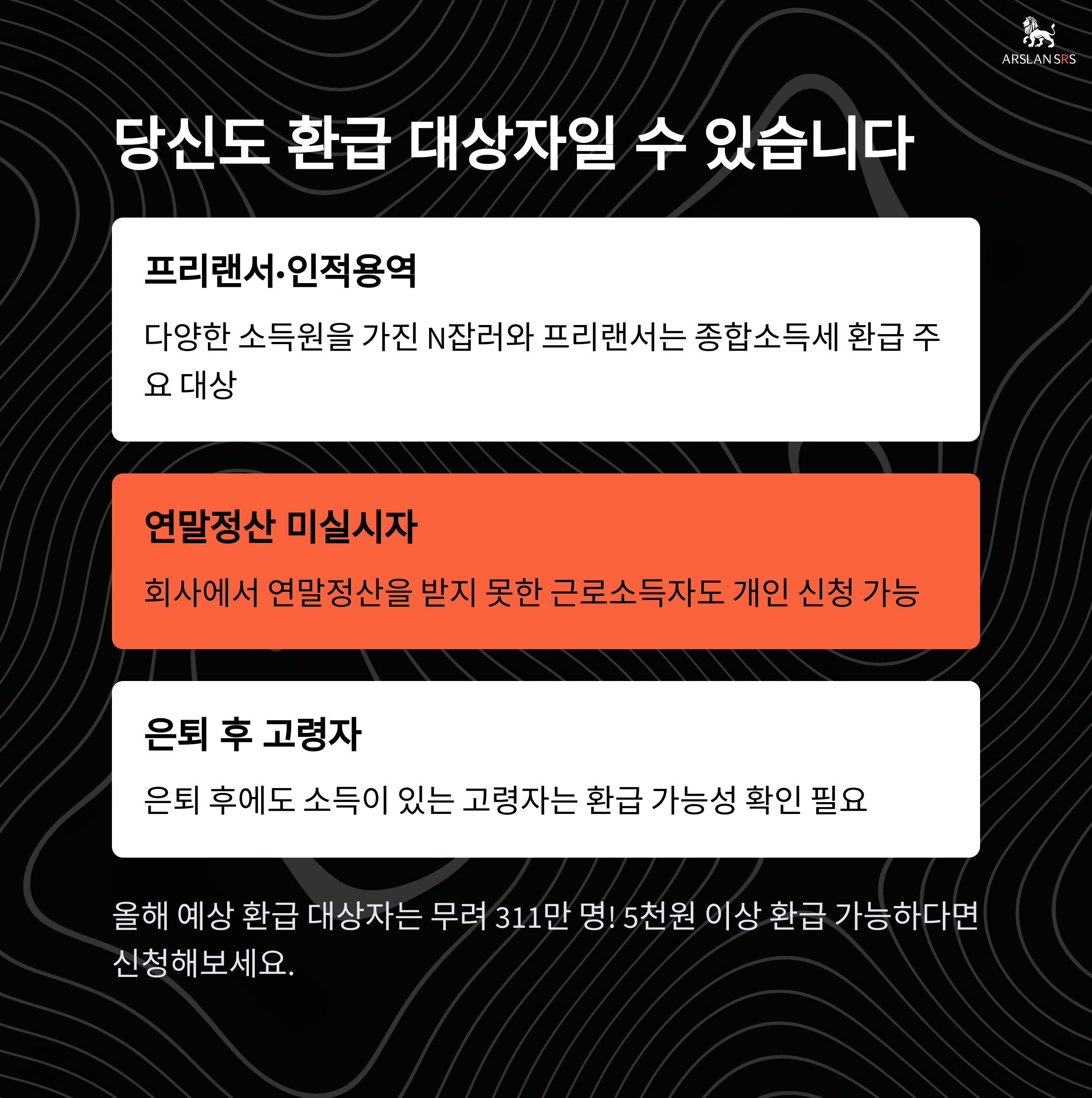 - 프리랜서 및 인적용역 소득자: 강의, 유튜브, 배달 등 부수입이 있는 경우 3.3% 원천징수 후 필요경비 적용 시 환급 가능성 ↑