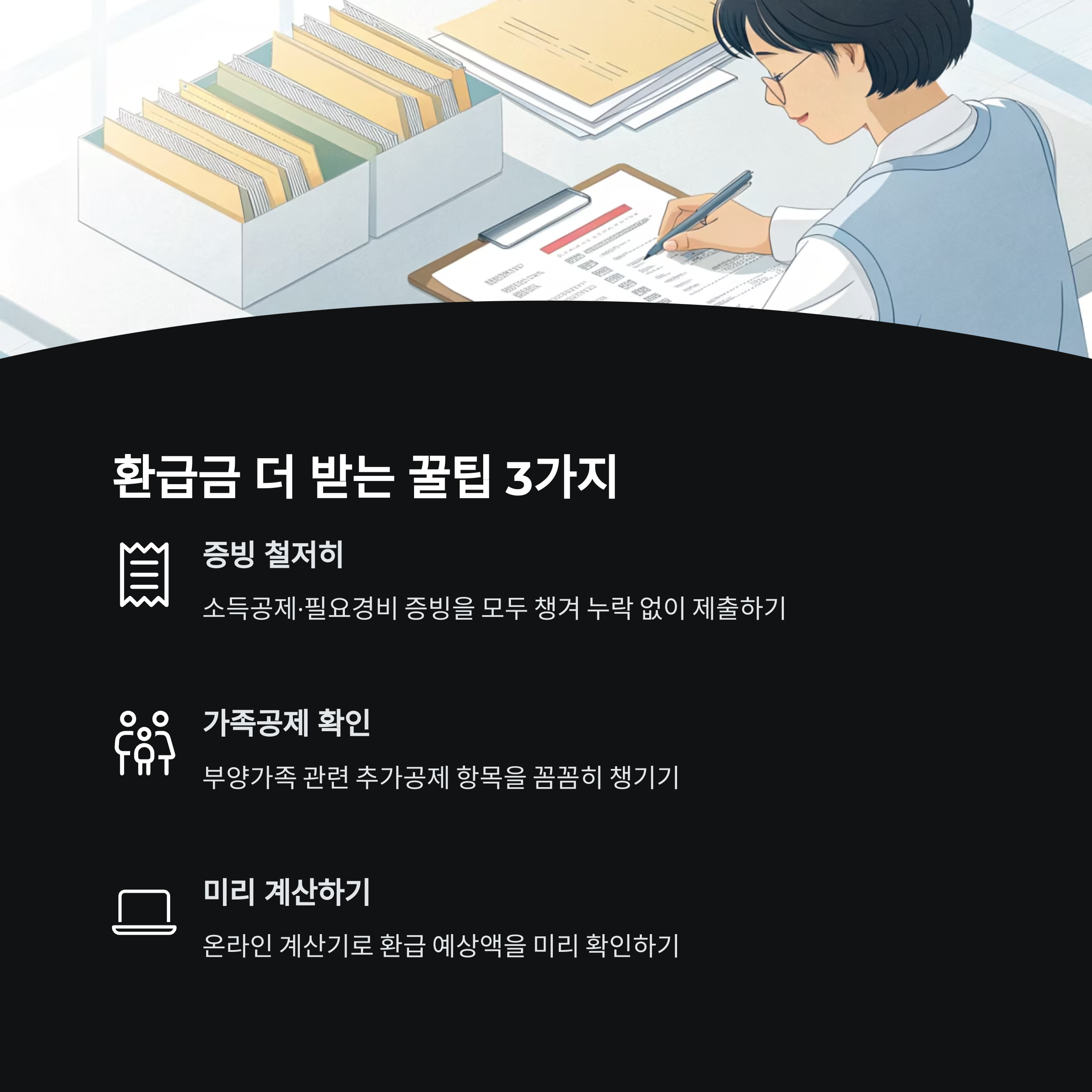 - 소득공제 항목 꼼꼼히 챙기기: 의료비, 교육비, 기부금 등 누락 없이 확인