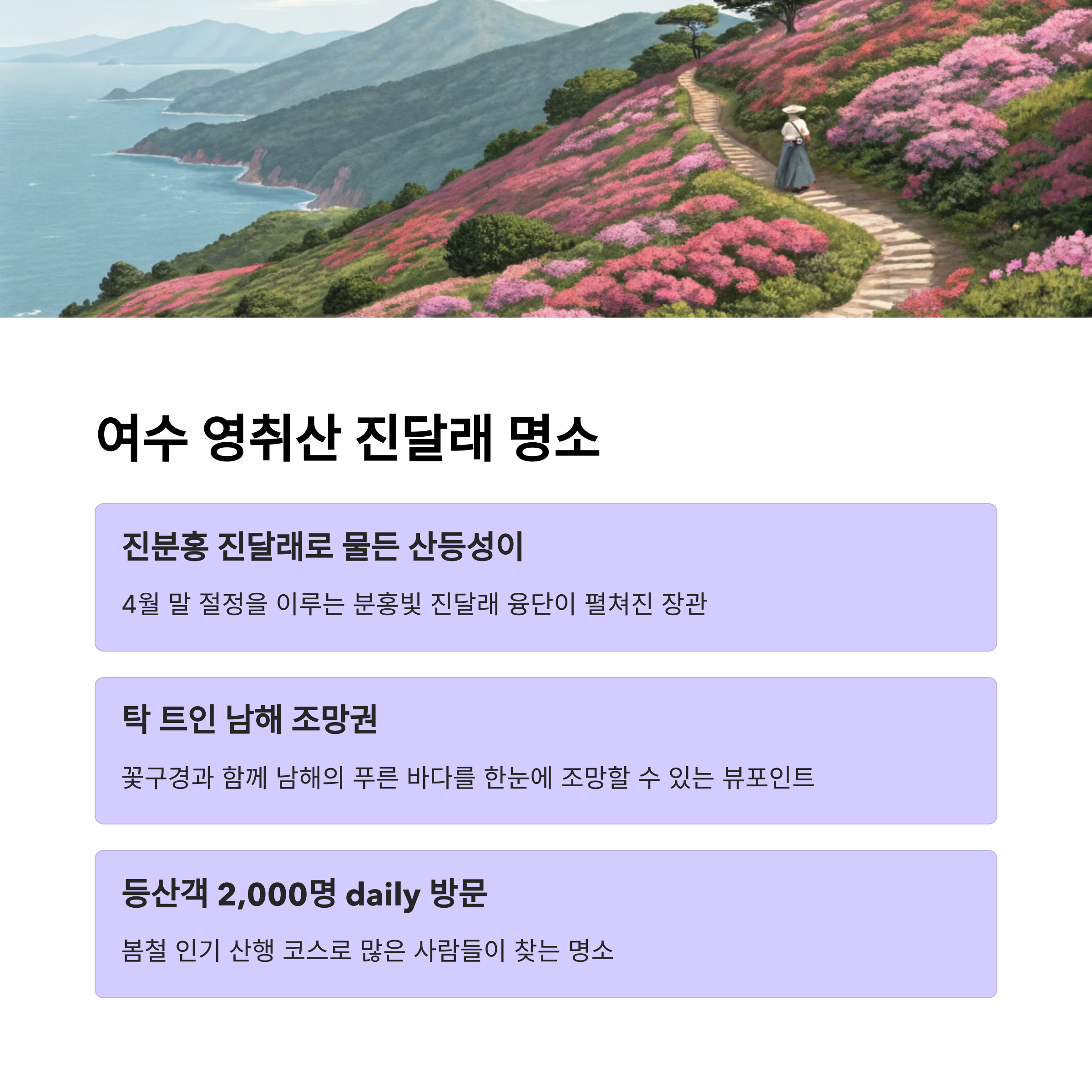 특징: 진달래가 산 전체를 물들이는 장관