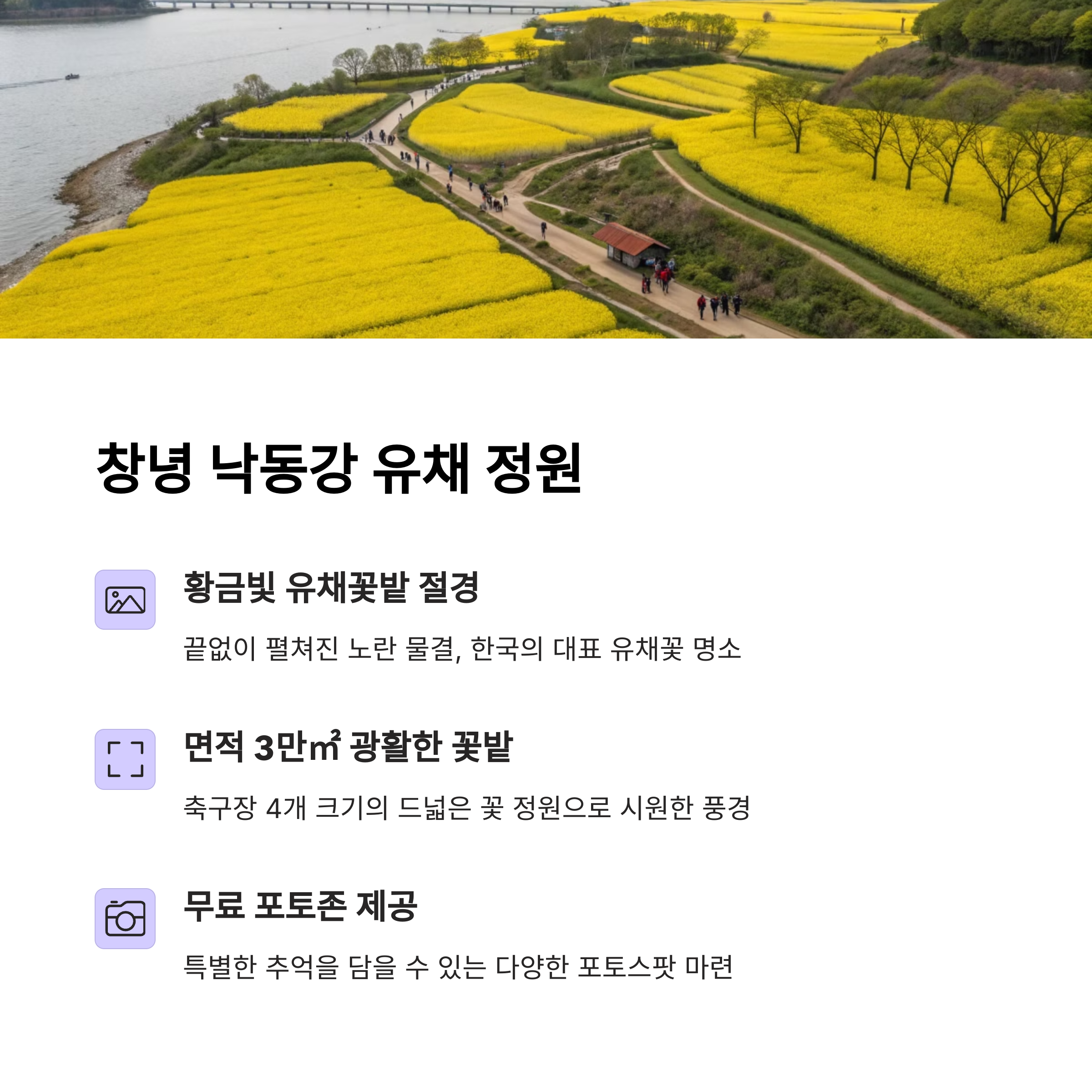끝없이 펼쳐진 노란 유채꽃밭은 마치 황금빛 물결 같습니다. 창녕의 유채 정원은 가족 단위 방문객에게 특히 인기가 많으며, 사진 촬영과 피크닉 장소로도 제격입니다.