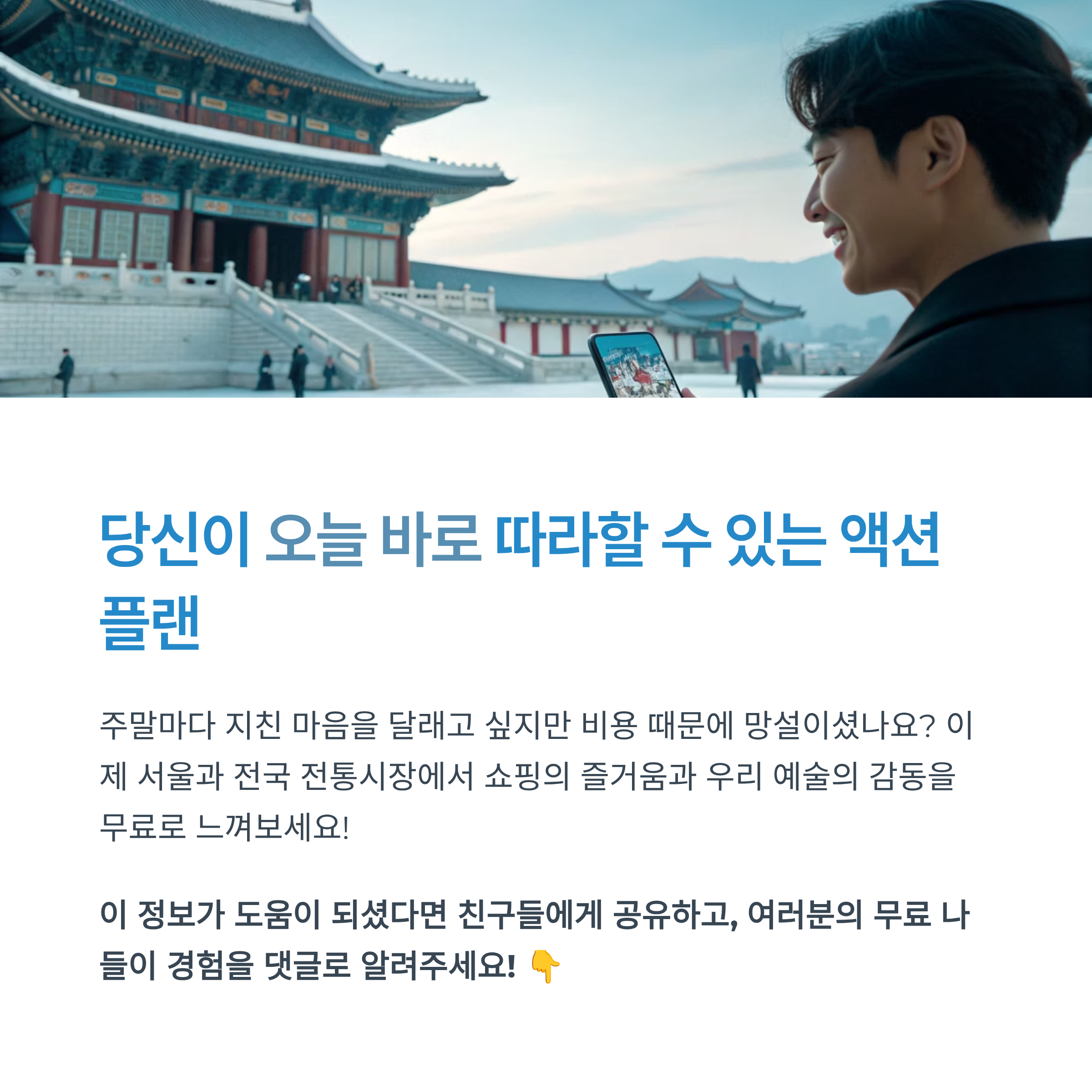 지금 바로, 집 근처 전통시장과 문화공간의 무료 공연 일정을 찾아보세요. 그리고 가족, 연인, 친구와 함께 '1원도 안 드는' 특별한 주말 나들이를 떠나보세요!