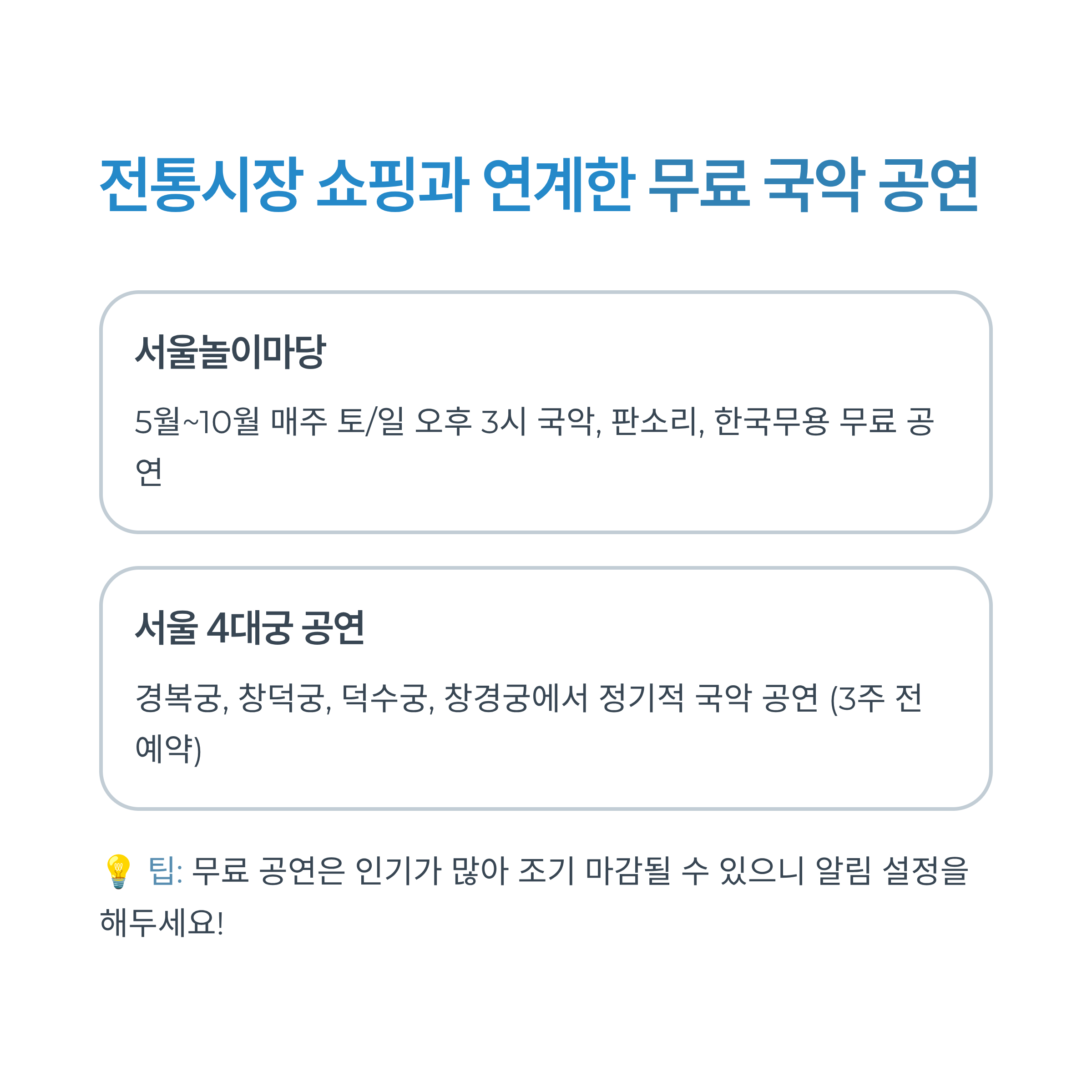 - 최신 무료 공연 일정 확인: 서울시 문화포털(culture.seoul.go.kr), 국립국악원 누리집(gugak.go.kr) 즐겨찾기 해두기.