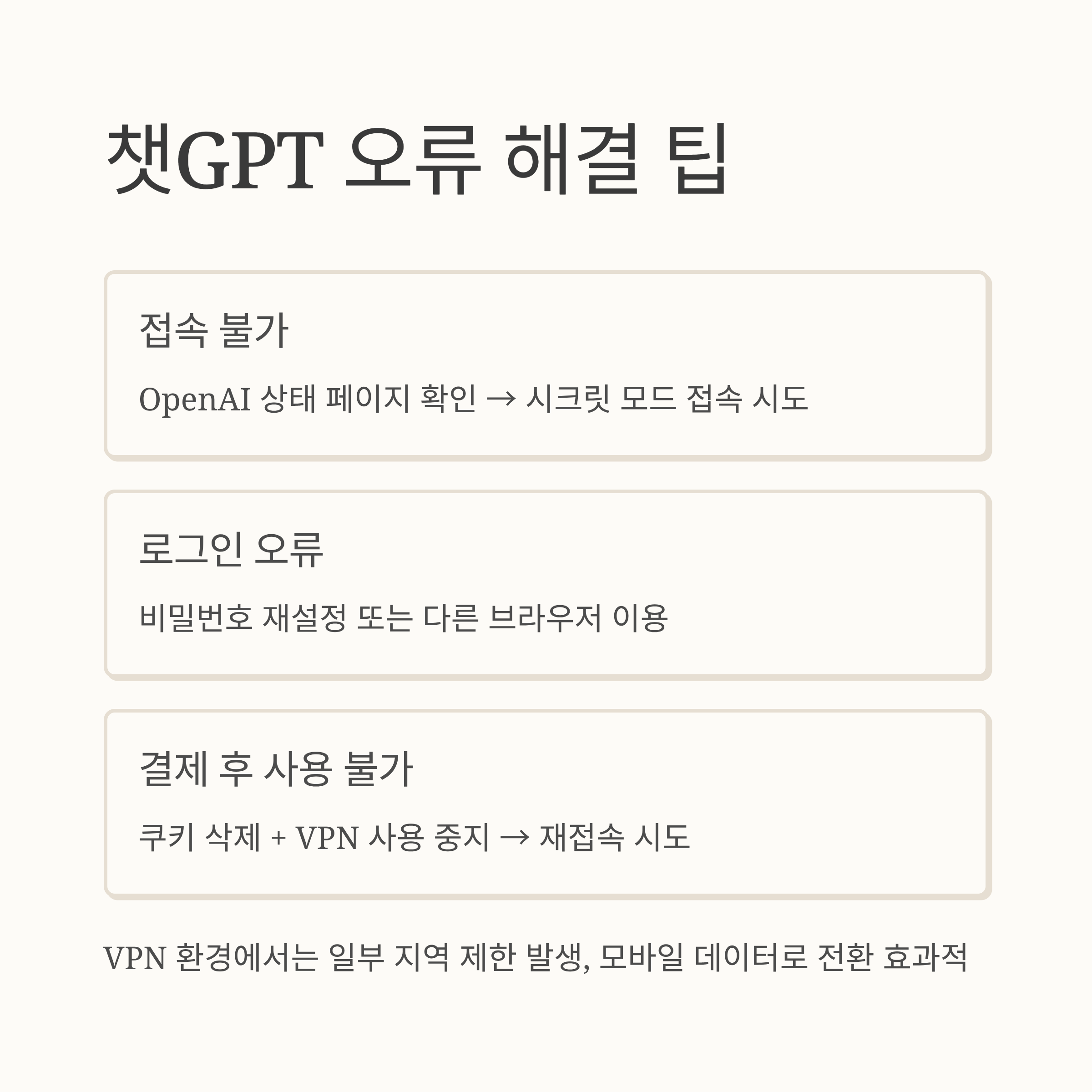 | 접속 불가 | OpenAI 상태 페이지 확인 → 시크릿 모드 접속 시도 |
