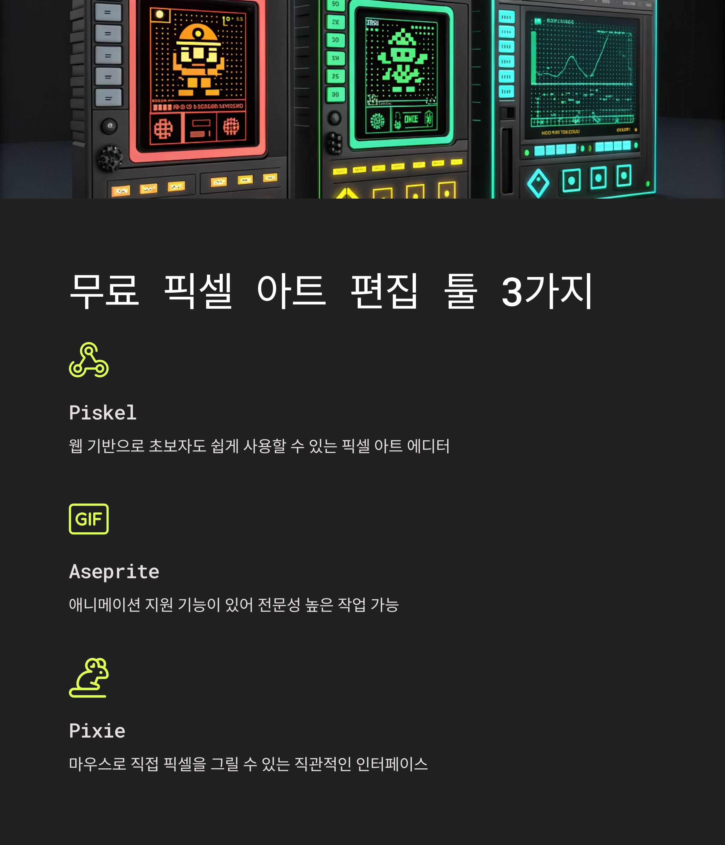 | Aseprite | 애니메이션 지원, 전문성 높음 |