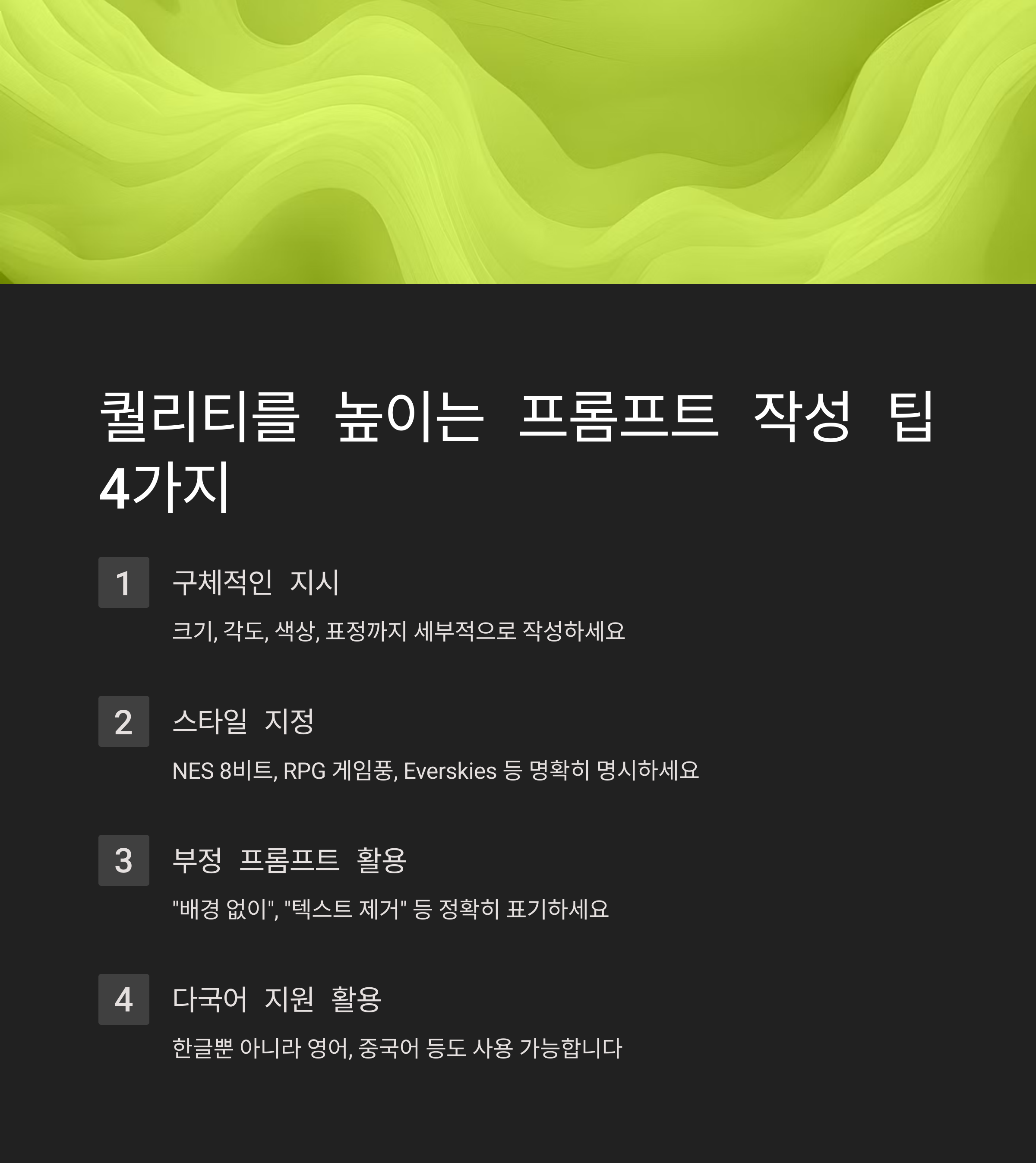 이 네 가지를 활용하면 원하는 이미지를 한 번에 얻을 확률이 높아집니다.