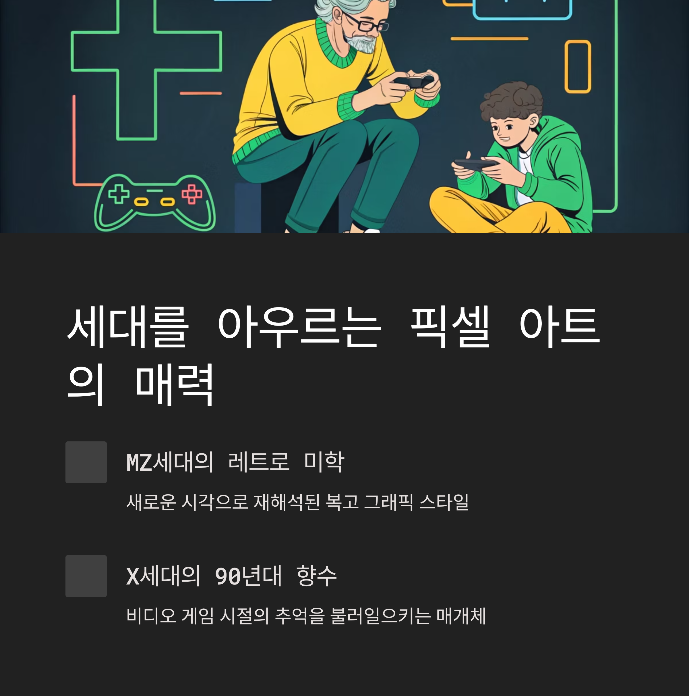픽셀 아트는 단순한 그래픽이 아닌, 세대별 감성과 추억을 자극하는 강력한 도구입니다.