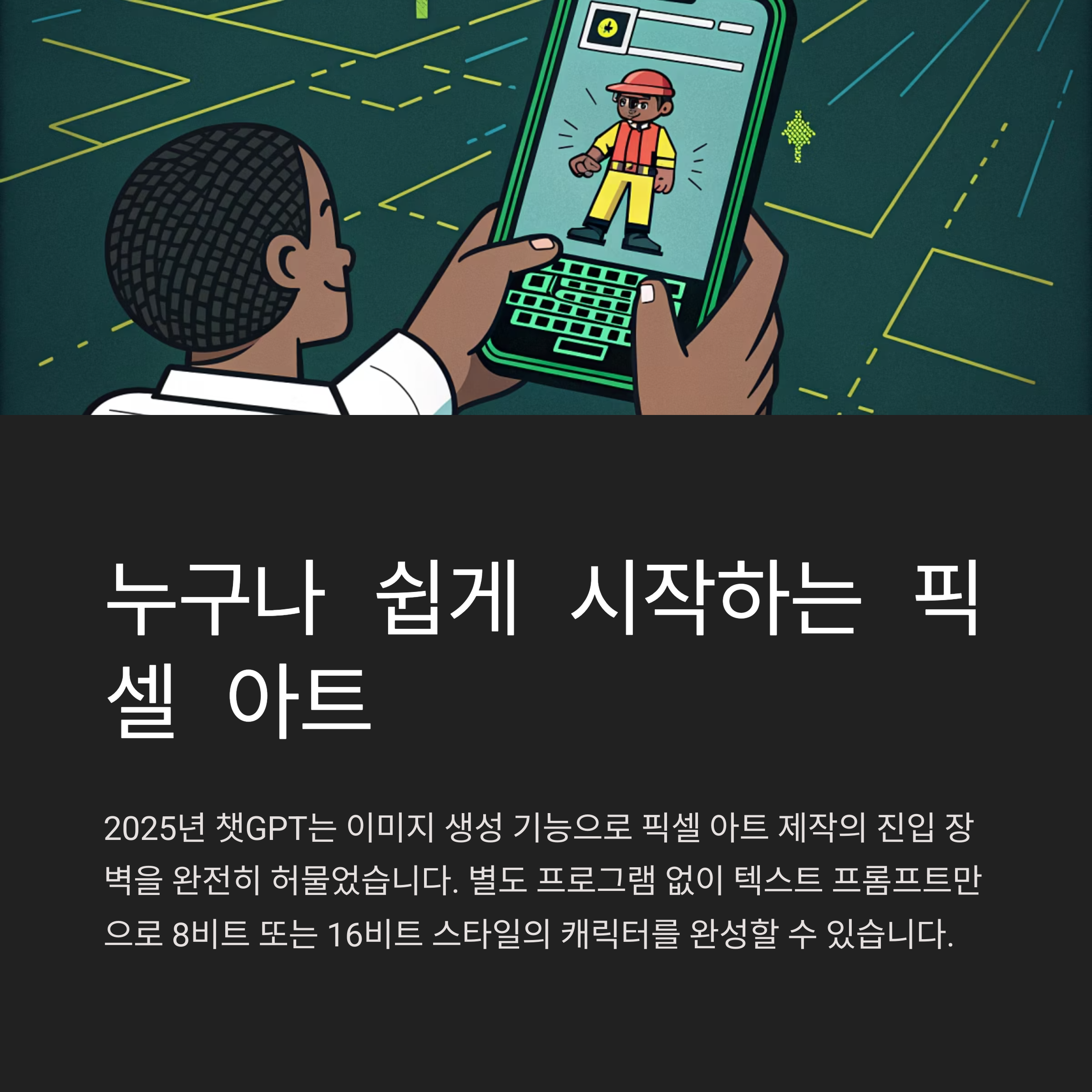 복고 감성과 AI 기술의 만남이 만들어낸 챗GPT 픽셀 아트 열풍이 2025년 SNS와 온라인 커뮤니티를 강타하고 있습니다. 단순한 8비트 그래픽 속에 담긴 감성은 세대를 아우르며 폭넓은 인기를 얻고 있고, 누구나 프롬프트 한 줄이면 손쉽게 나만의 도트 캐릭터를 만들 수 있는 시대가 되었습니다. 이 글에서는 챗GPT 픽셀 아트가 왜 인기인지, 어떻게 만들 수 있는지, 성공적인 프롬프트 작성 팁과 함께 실전 가이드를 자세히 소개해드립니다.
