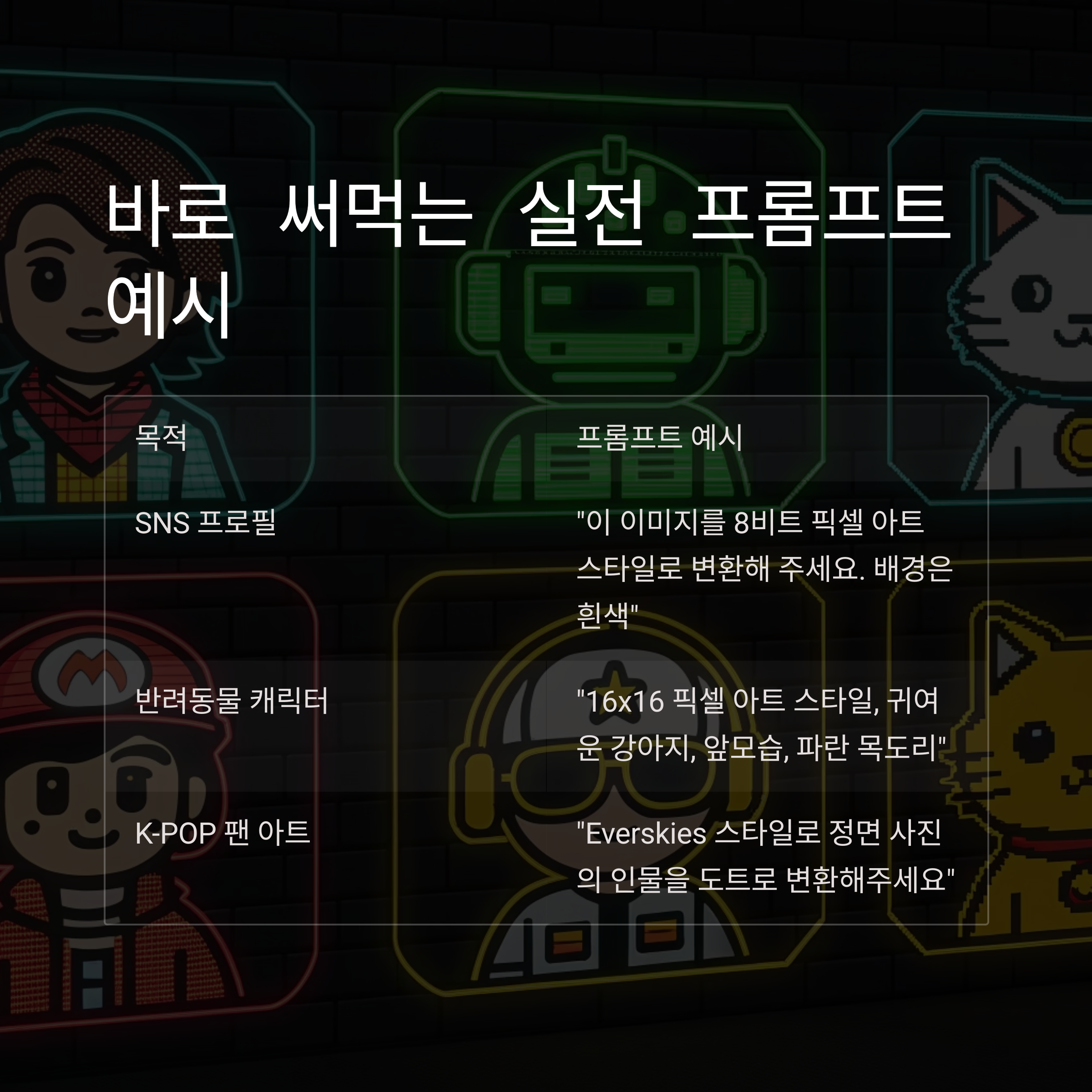 | K-POP 팬 아트 | "Everskies 스타일로 정면 사진의 인물을 도트로 변환해주세요" |