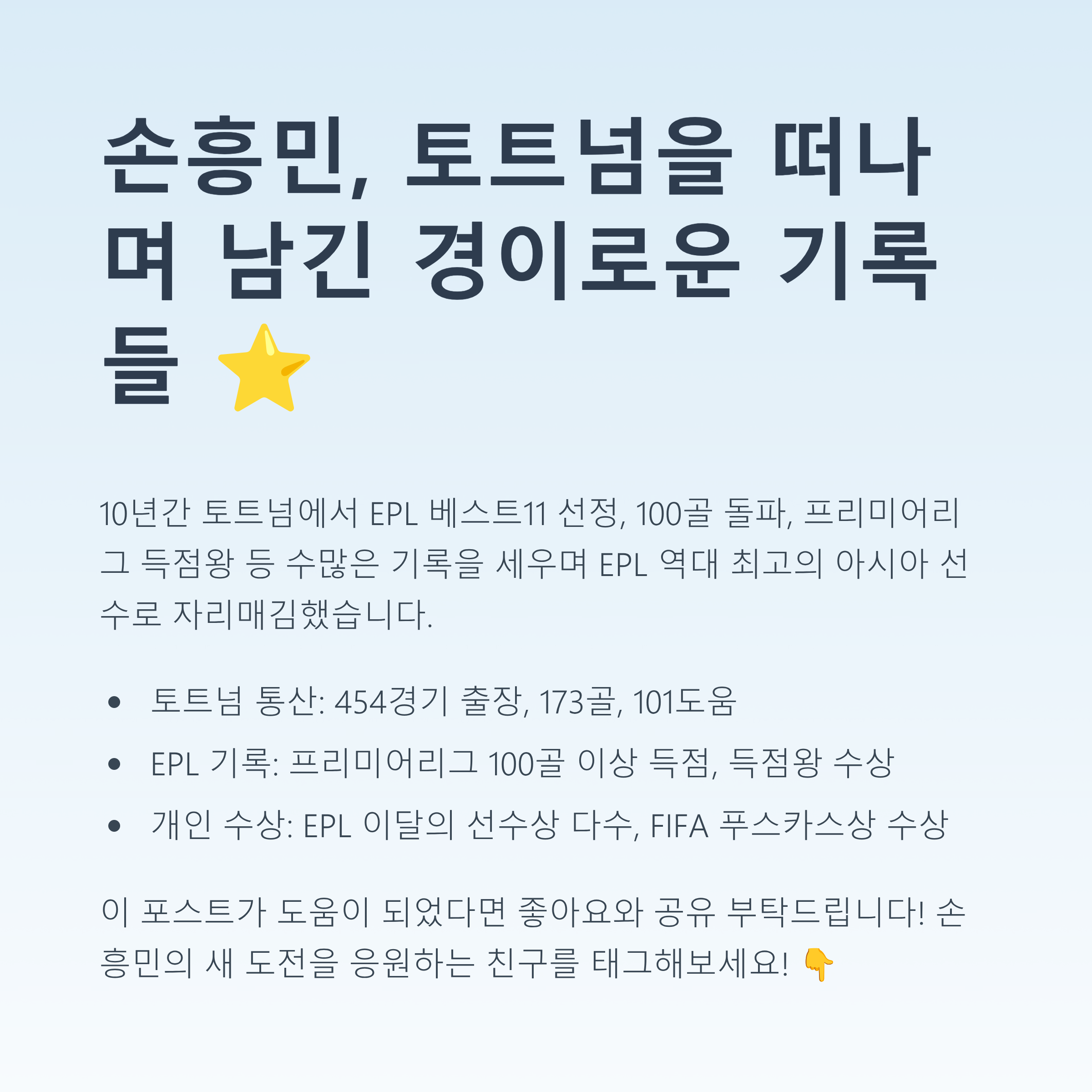 손흥민 선수의 이번 이적은 단순한 팀 이동이 아니라, 10년의 헌신에 대한 아름다운 마침표이자 새로운 역사의 시작이라고 생각해요. 팀과 팬을 향한 그의 진심이 느껴져서 더 감동적이었던 것 같습니다. 토트넘을 떠나 미국에서 새로운 축구 인생 2막을 시작할 손흥민 선수! 그의 빛나는 도전과 활약을 진심으로 응원합니다!