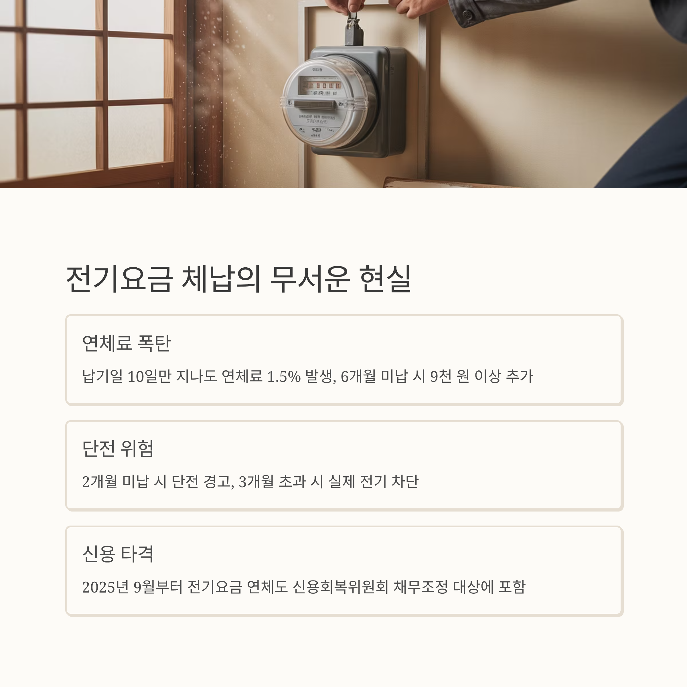 이 부분이 진짜 중요해요! 장기 체납 이력은 신용평가에 당연히 나쁜 영향을 주고요. 무엇보다 2025년 9월부터는 연체된 전기요금도 신용회복위원회 채무조정 통합 심사 대상에 포함됩니다. 쉽게 말해, 전기요금 연체가 대출이나 신용카드 발급에 직접적인 불이익으로 이어진다는 뜻이에요. - 사업하시는 분들은 더 큰 문제! 💸