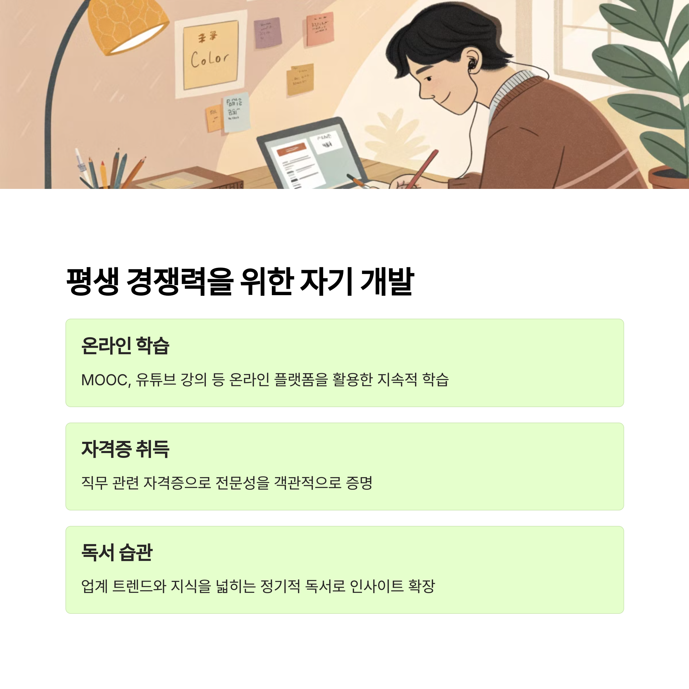 기술이 발전할수록 오히려 인간만이 가질 수 있는 소프트 스킬의 가치가 높아지고 있습니다. 의사소통 능력, 창의성, 문제 해결 능력, 팀워크 등을 키우는 데 노력해보세요.