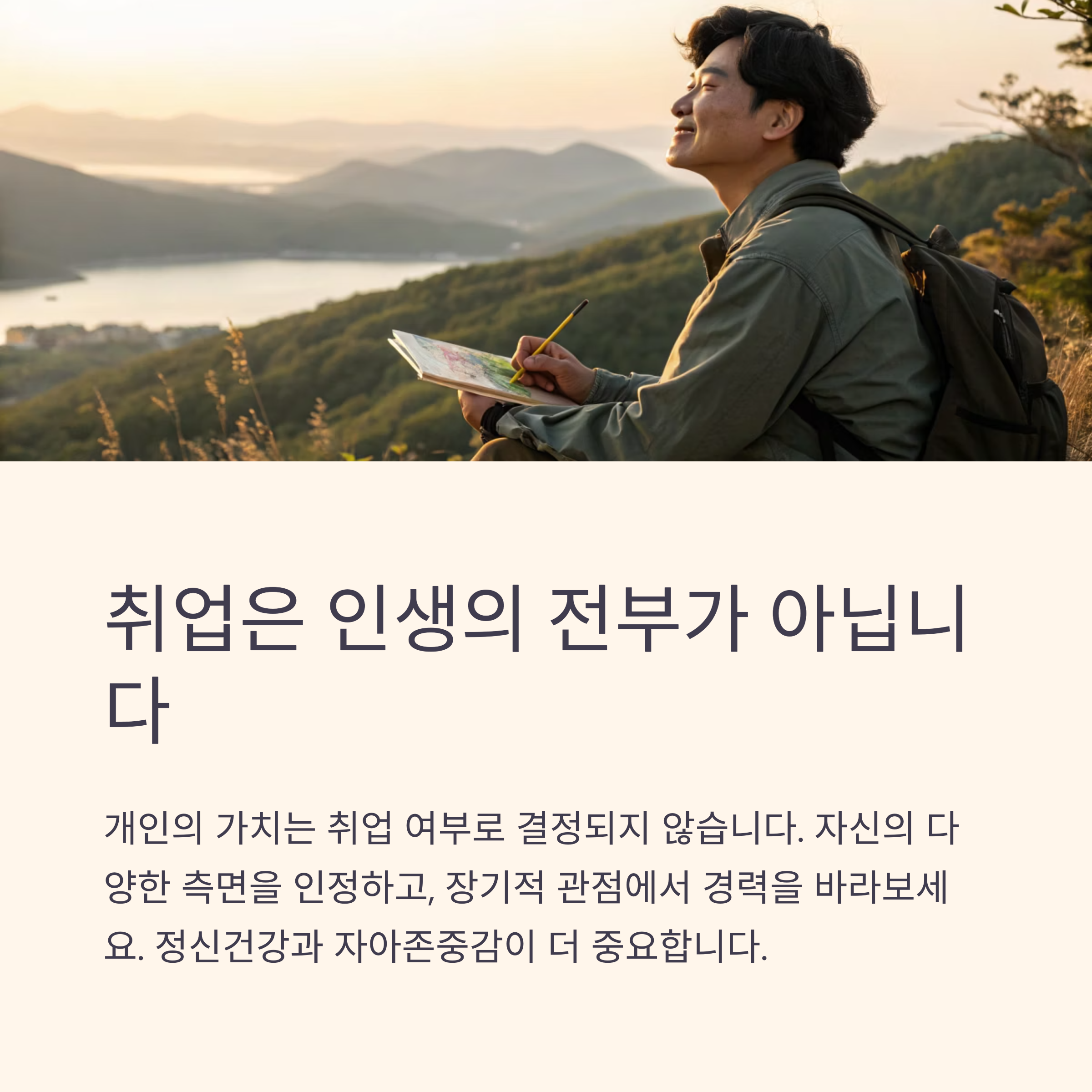 마지막으로, 취업은 인생의 전부가 아니라는 것을 기억하세요. 취업 준비 과정에서 배우는 것들이 앞으로의 인생에 큰 자산이 될 것입니다. 지금 겪는 어려움은 언젠가 여러분을 더 강하게 만들어줄 것입니다.