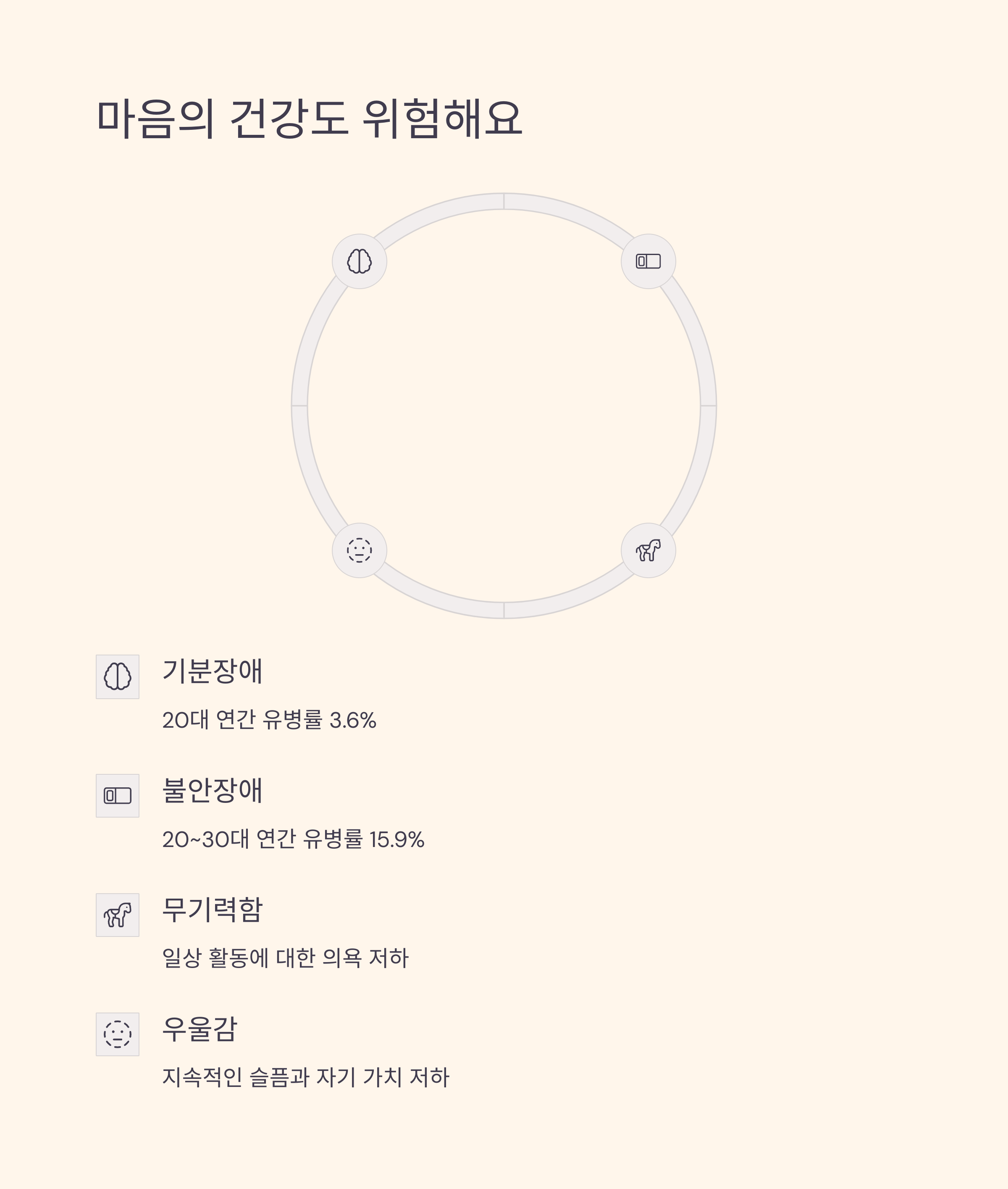 더 심각한 것은 취업 스트레스가 우울감으로 이어질 수 있다는 점입니다. 한 연구에 따르면 대학생의 취업 스트레스는 자아존중감을 낮추고 우울감을 높이는 것으로 나타났습니다. 이는 단순한 일시적 기분 저하가 아니라 장기적인 정신 건강에도 영향을 미칠 수 있다는 의미입니다.