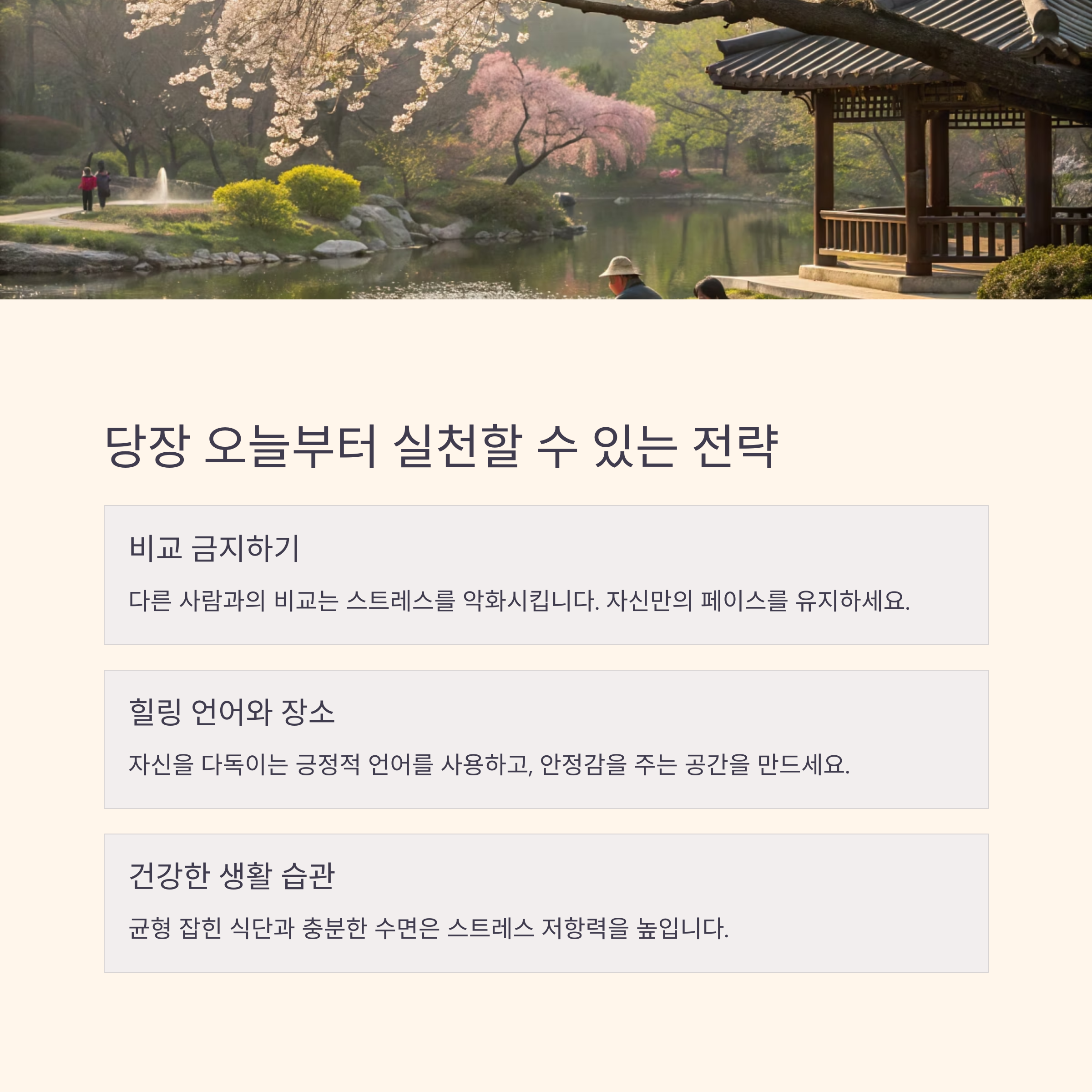 매일 저녁 5분만 시간을 내어 오늘 내가 느낀 감정과 신체 상태를 점검해보세요. 평소보다 짜증이 늘었거나, 집중력이 떨어졌다면 스트레스 신호일 수 있습니다.