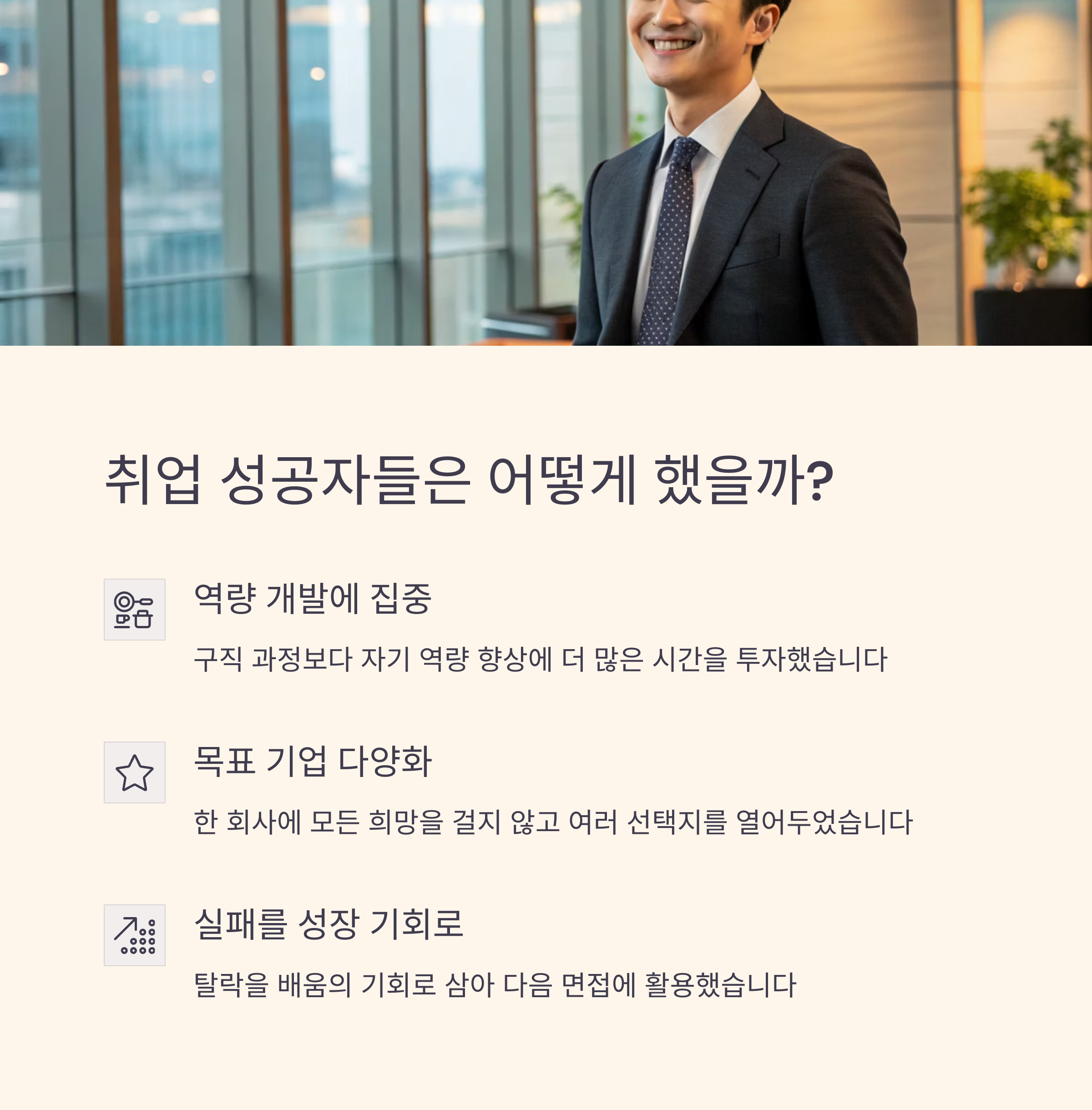취업에 성공한 사람들은 실패를 두려워하지 않았습니다. 오히려 실패를 통해 배우고 성장했죠. 한 취업 성공자는 "면접에서 탈락할 때마다 피드백을 요청하고, 그것을 바탕으로 부족한 부분을 보완했다"고 말합니다.