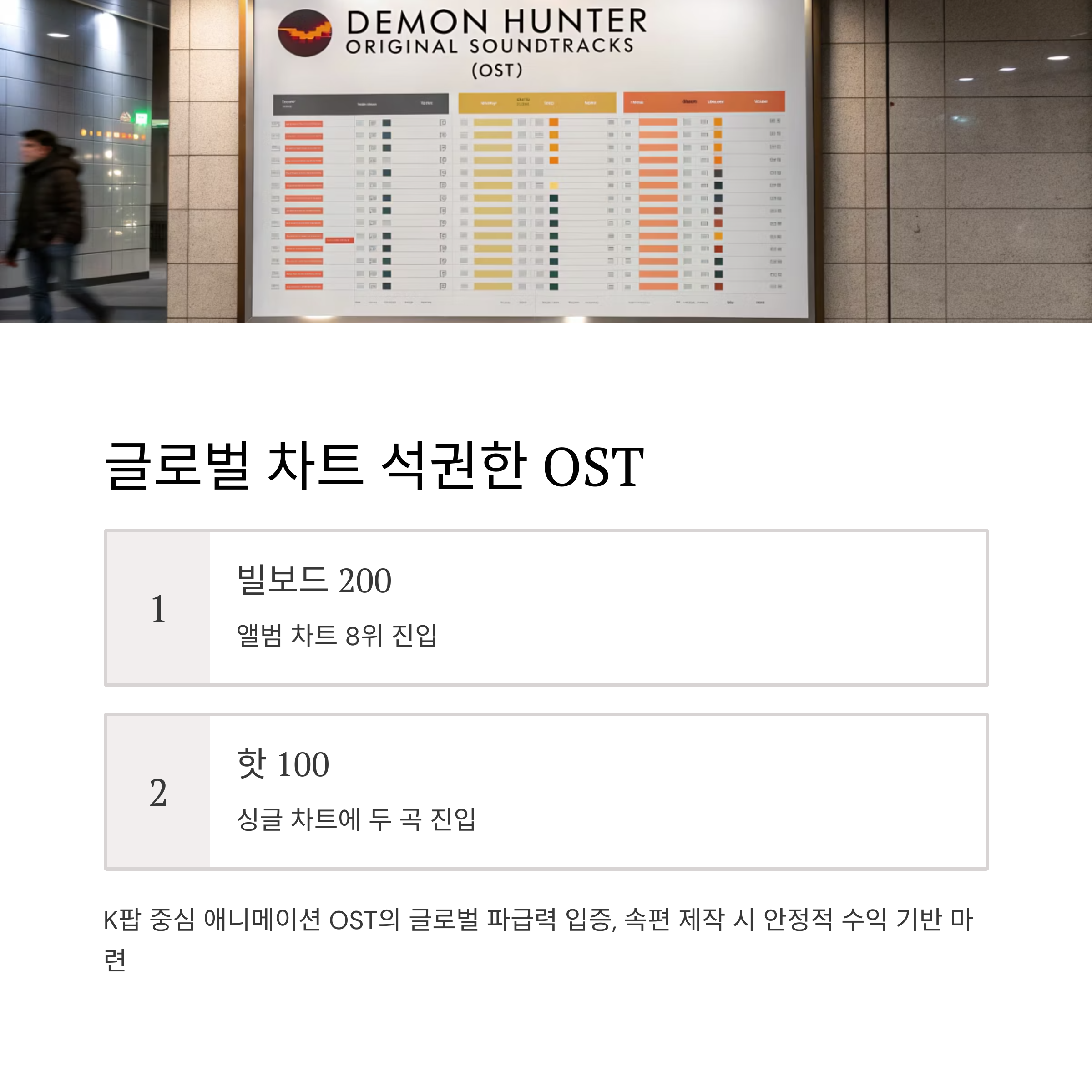 OST는 빌보드 200 앨범 차트 8위, 핫 100 싱글 차트에는 두 곡이 진입하는 기록을 세우며 K팝 중심의 애니메이션 OST가 글로벌 차트에서 어떤 파급력을 가질 수 있는지 보여줬습니다. 이는 음악 중심 IP 콘텐츠로서 케이팝 데몬 헌터스가 갖는 확장성과 지속 가능성을 입증하는 사례이며, 속편 제작 시에도 OST 판매와 스트리밍 수익에 대한 안정적 기반이 마련되었음을 시사합니다.
