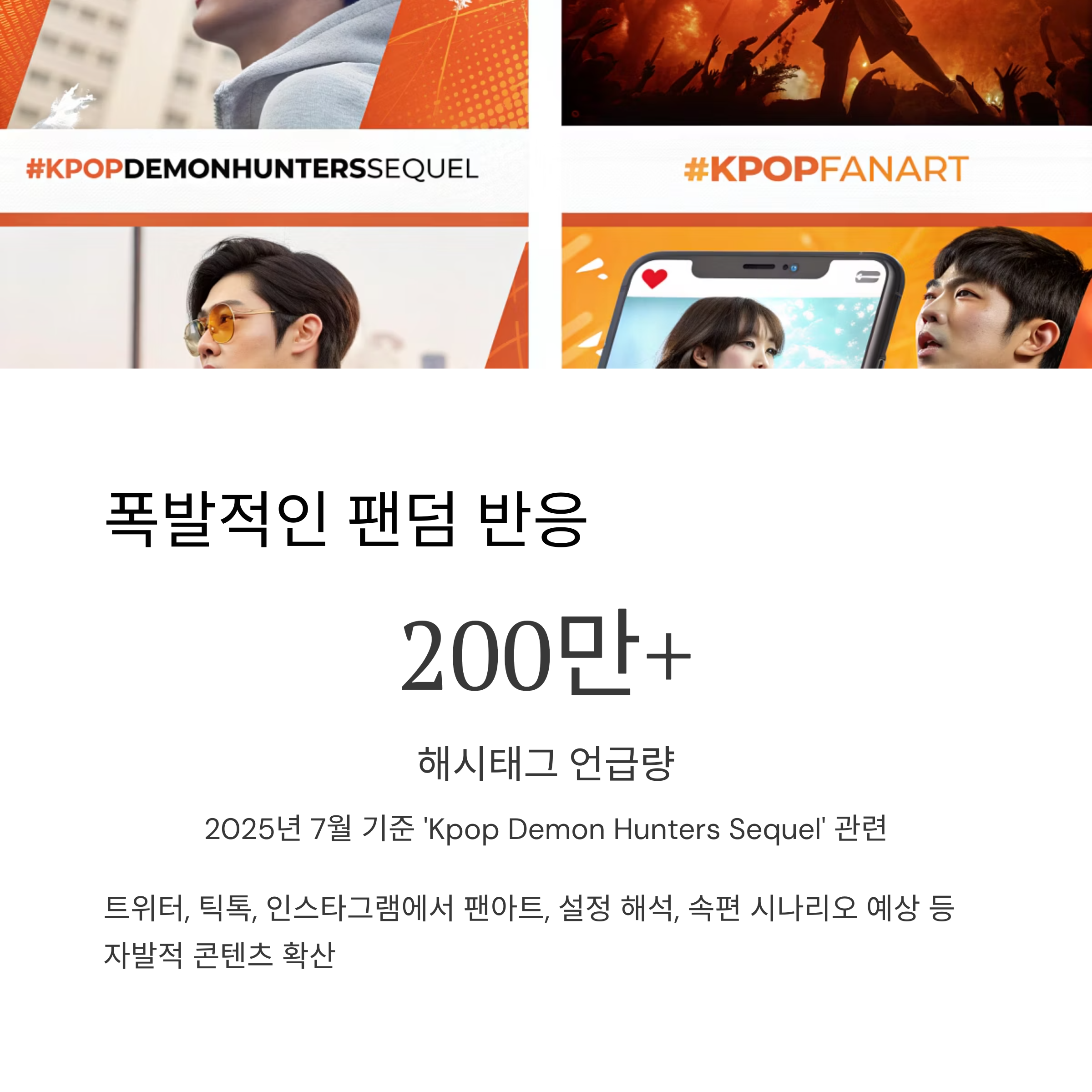 실시간 SNS 분석에 따르면, 2025년 7월 기준 'Kpop Demon Hunters Sequel' 관련 해시태그 언급량은 200만 건을 돌파했습니다. 특히 글로벌 트위터, 틱톡, 인스타그램을 중심으로 수많은 팬아트, 설정 해석, 속편 시나리오 예상 등이 올라오며 자발적인 팬 콘텐츠가 확산되고 있습니다. 이는 제작사 입장에서도 시장성과 흥행성을 입증하는 살아 있는 지표로 작용할 수 있습니다.