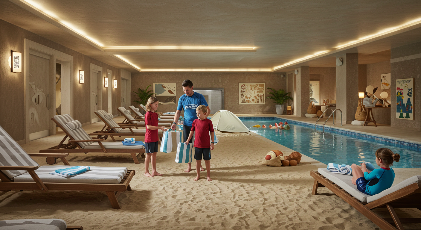 필수 준비물은 수영복, 래쉬가드(티셔츠형 권장), 모자, 아쿠아슈즈, 방수팩, 선크림, 보조배터리입니다. 모자는 슬라이드 탑승 시 벗어야 하니 탈부착 쉬운 제품이 좋아요. 비치체어는 사전 예약(방문 7일 전부터) 가능하며, 실내 샌디풀 주변이 명당입니다. 슬라이드는 실내·실외 모두 정상 운영되지만, 기온에 따라 일부 조기 종료될 수 있습니다.