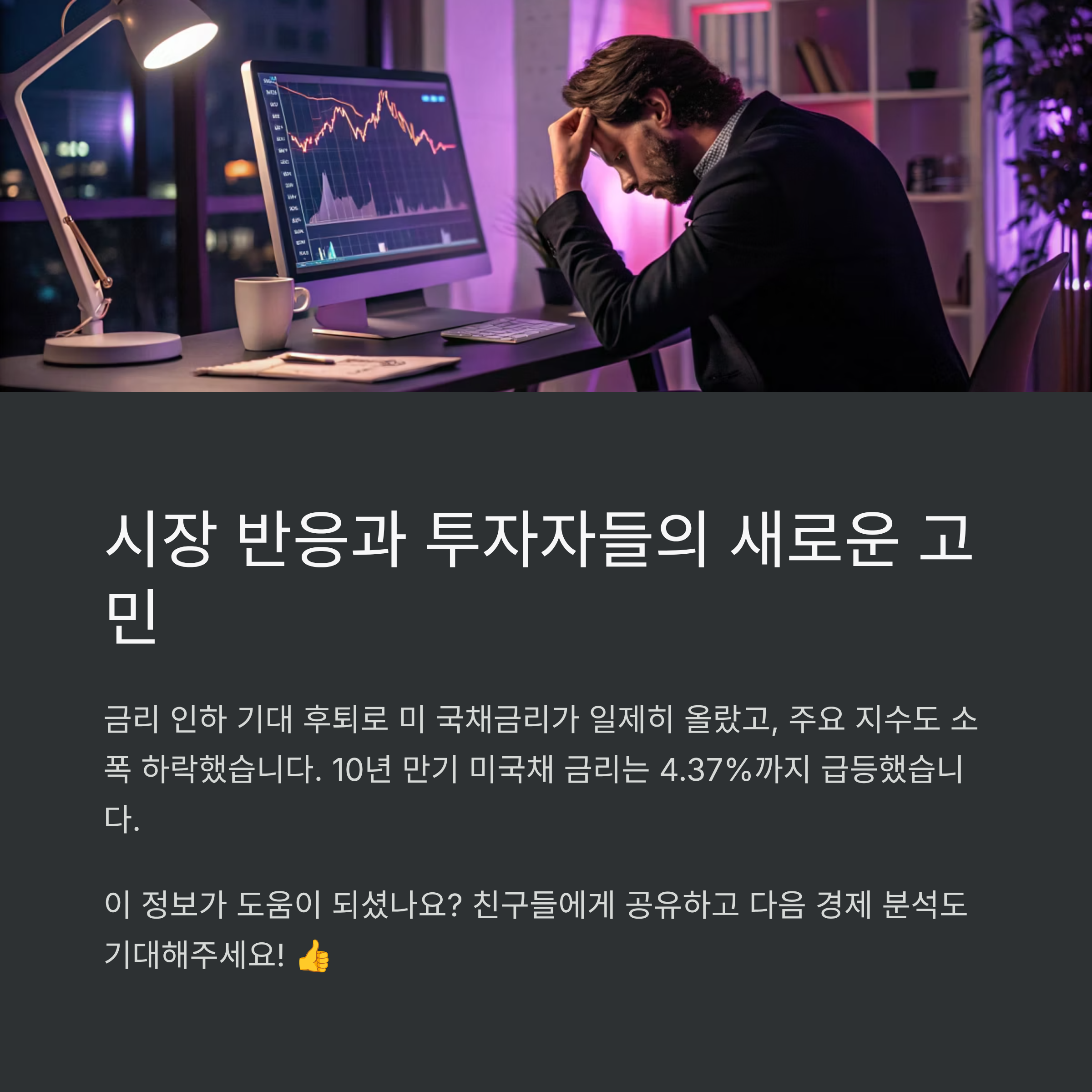금리 인하 기대가 후퇴하자마자 시장은 즉각적으로 반응했습니다. 미 국채금리가 일제히 올랐고, S&P 500과 다우지수 등 주요 지수도 소폭 하락하며 숨 고르기에 들어갔죠. 특히 10년 만기 미국채 금리가 4.37%까지 급등한 것은 연준의 신중론을 시장이 얼마나 심각하게 받아들이고 있는지를 보여줍니다. 이제 투자자들은 9월보다는 연말이나 그 이후에나 금리 인하가 가능할 것으로 보고 있어요.