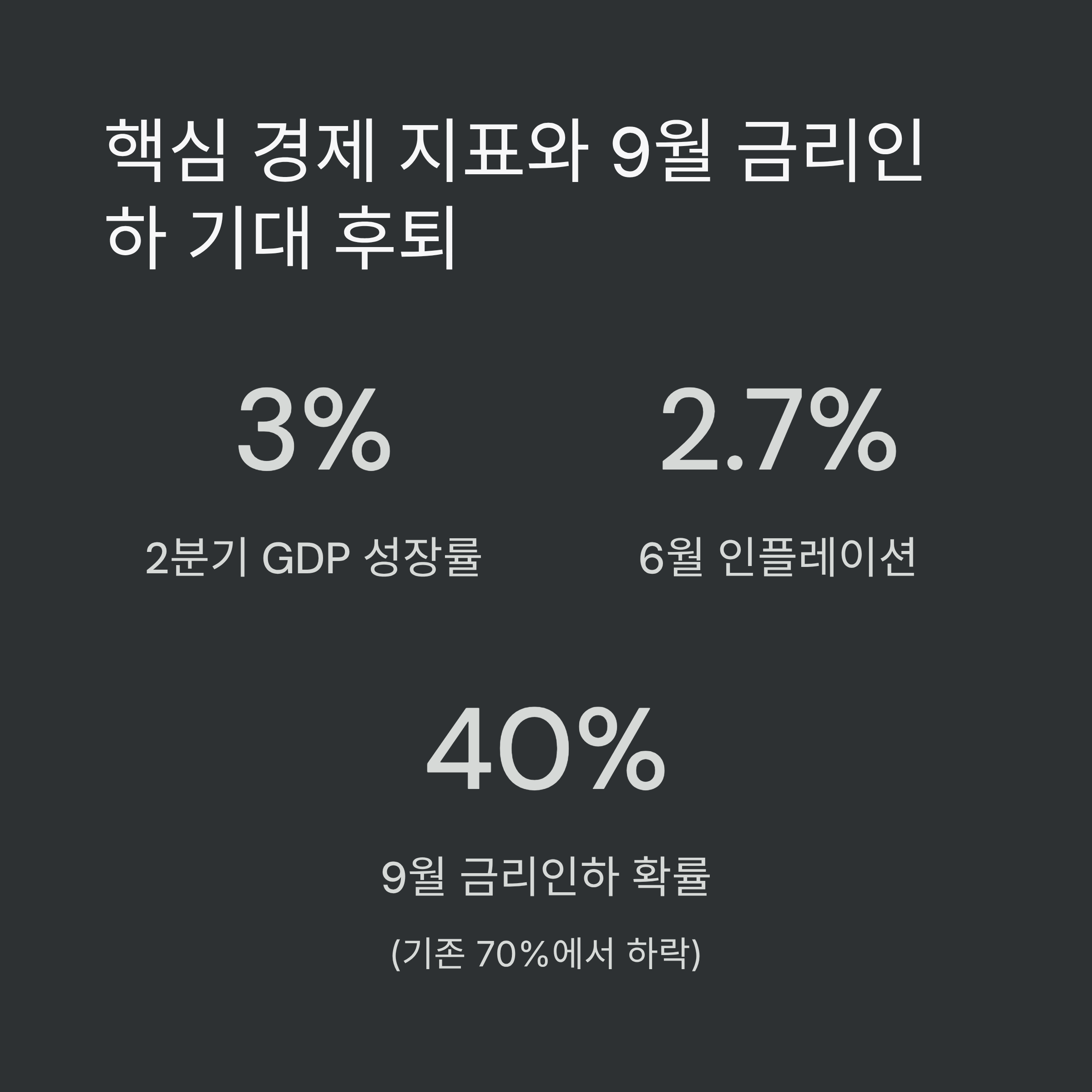 - 9월 인하 기대 후퇴: 파월 의장의 신중론과 여전히 높은 물가 지표 때문에, 9월 금리 인하 확률은 70%에서 40%로 급락했어요.