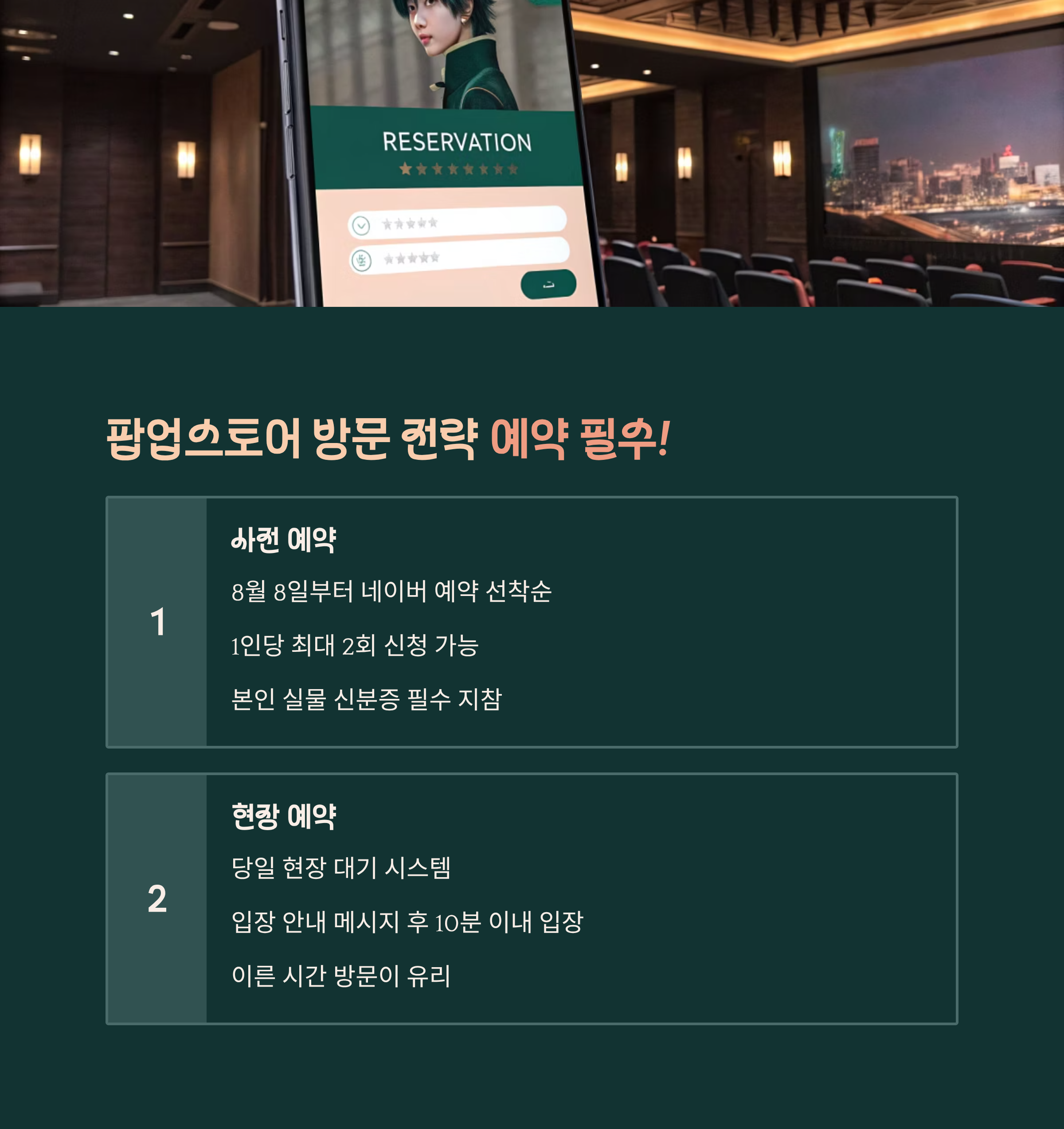 - 사전 예약자는 실물 신분증 지참: 모바일 신분증이나 사진은 절대 인정되지 않으니 꼭 실물 신분증을 챙기세요.