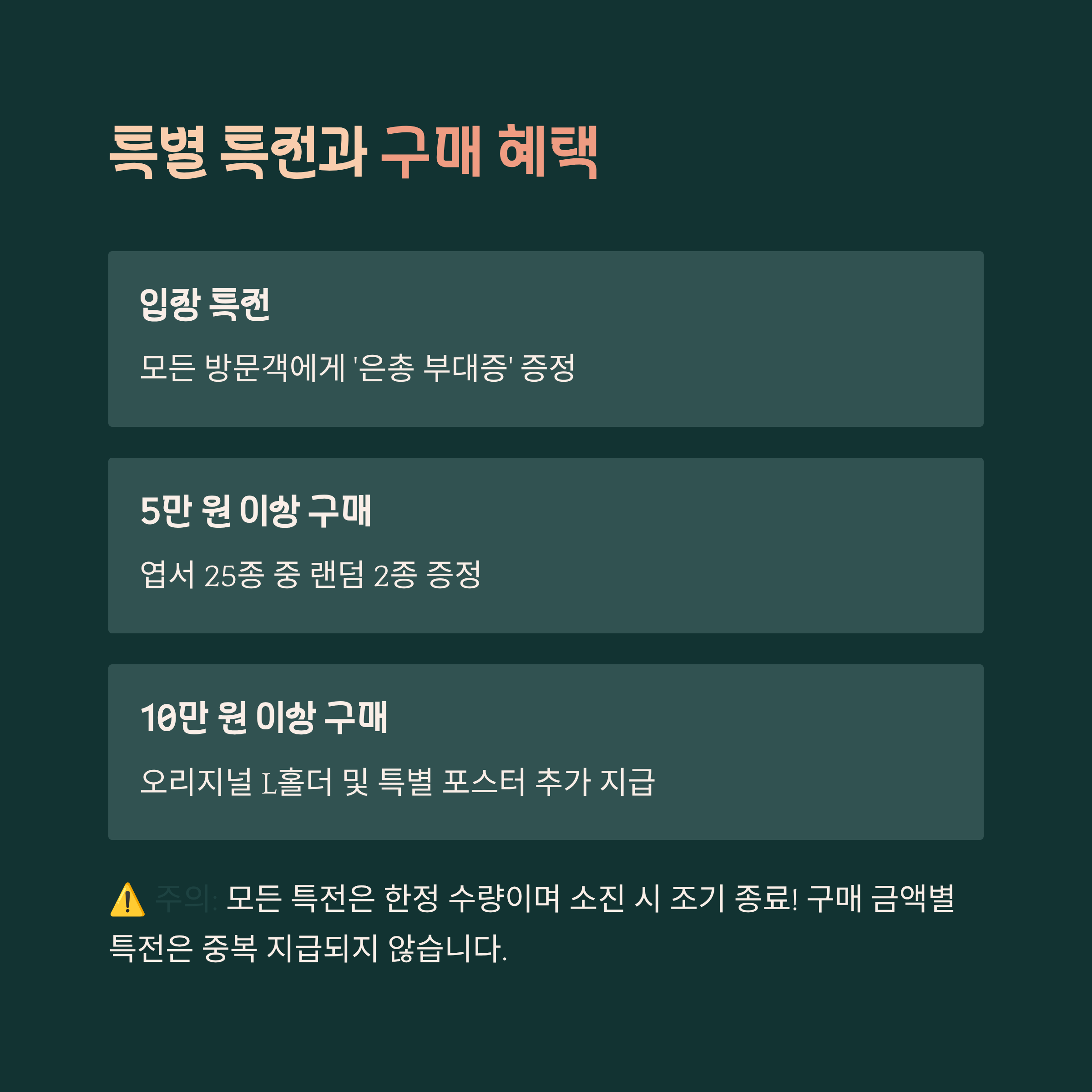 한 가지 더! 서울 행사 종료 후 9월에는 부산에서도 동일한 방식으로 팝업스토어가 열린다고 해요. 서울 방문이 어려운 분들에게는 정말 좋은 기회겠죠? 다만, 굿즈나 특전 구성이 조금씩 달라질 수 있으니 방문 전 공식 공지사항을 반드시 확인하는 센스가 필요합니다.
