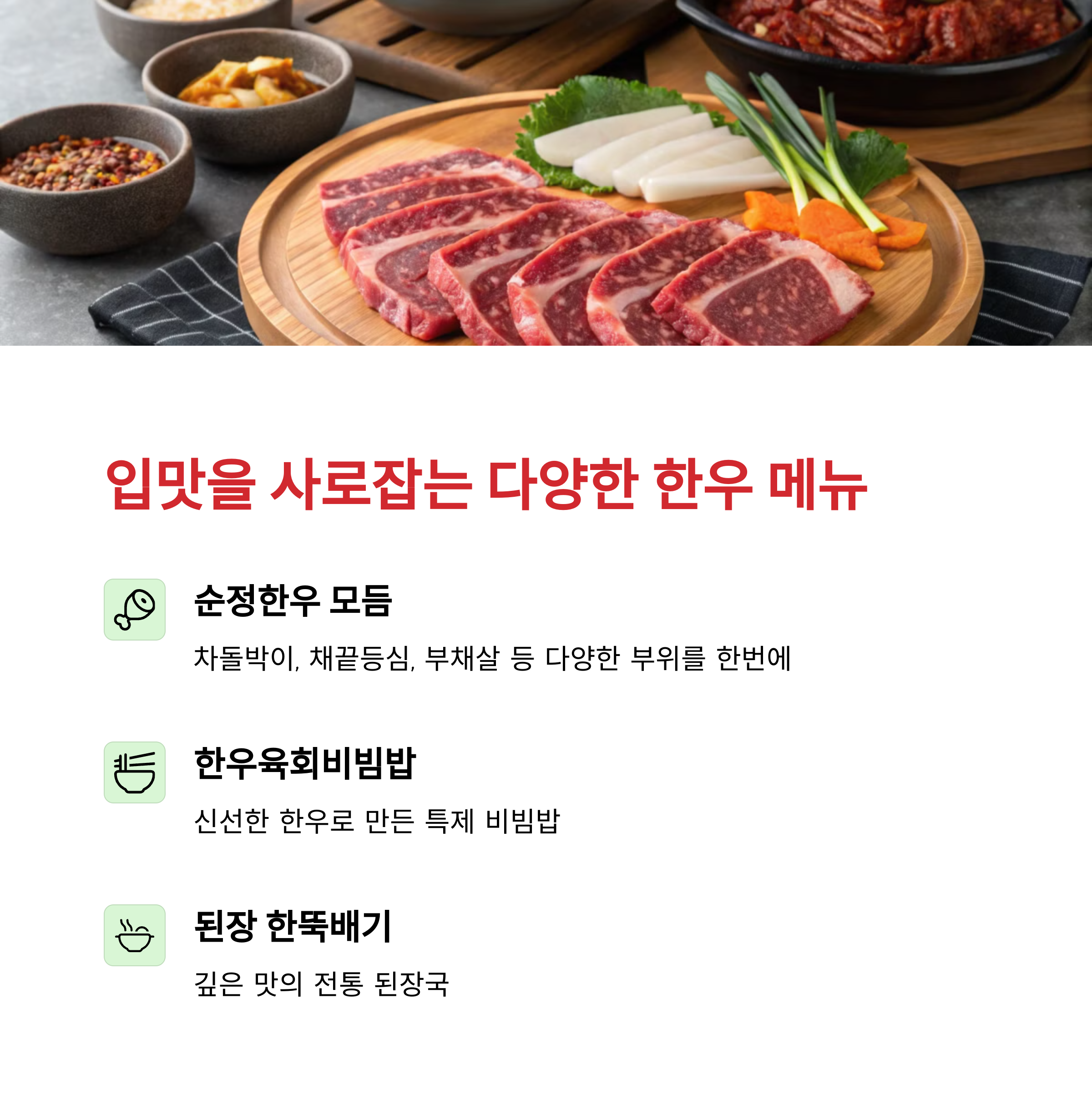 추천 메뉴: 순정한우 모듬과 한우육회비빔밥, 된장 한뚝배기를 함께 주문해보세요.