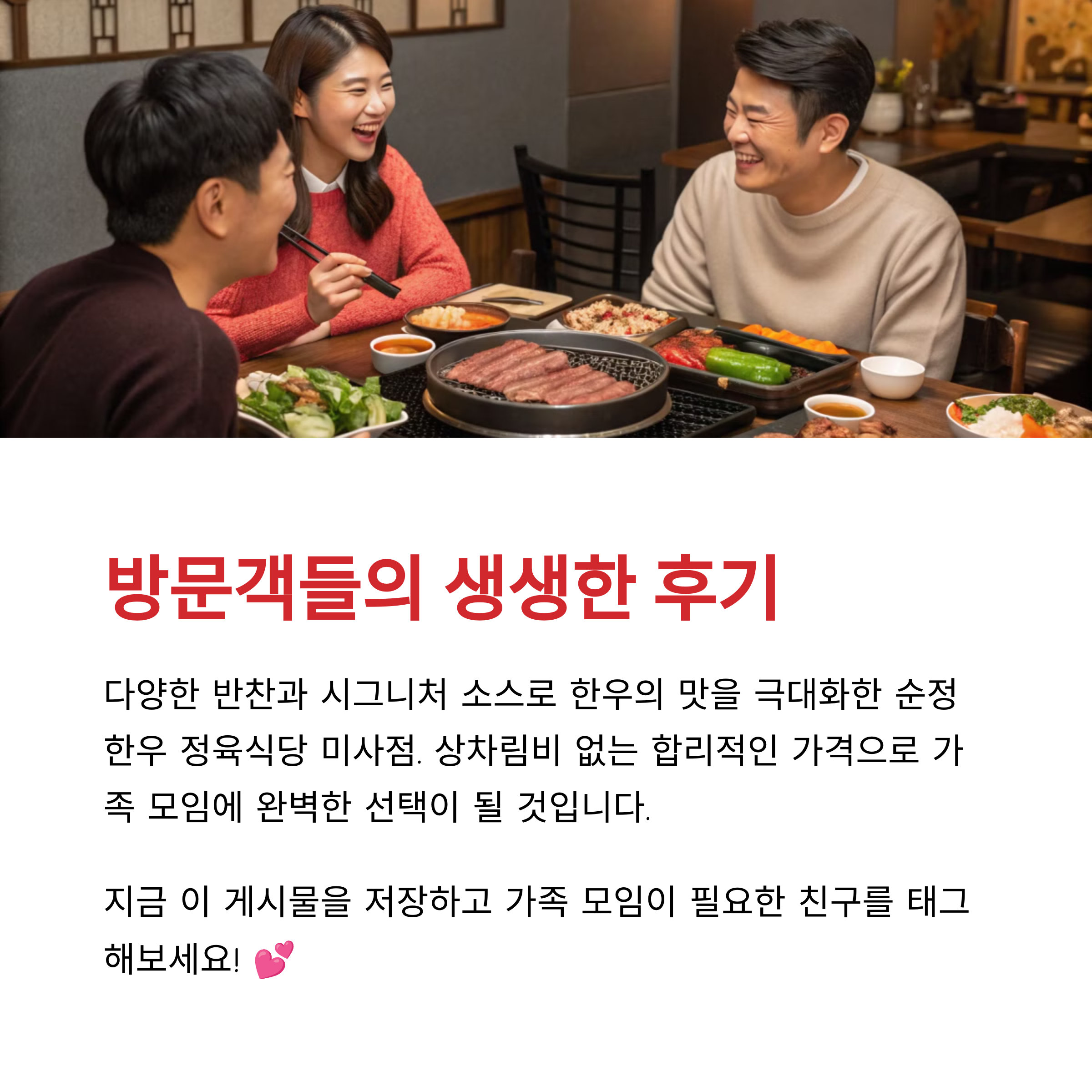하남 미사역 근처에 위치한 순정한우 정육식당 미사점은 가족모임에 적합한 소고기 전문점입니다. 이곳은 상차림비가 없는 정육식당으로, 다양한 한우 메뉴를 합리적인 가격에 제공합니다. 순정한우의 대표적인 메뉴들부터 분위기, 서비스까지, 모든 면에서 가족모임에 적합한 곳입니다.