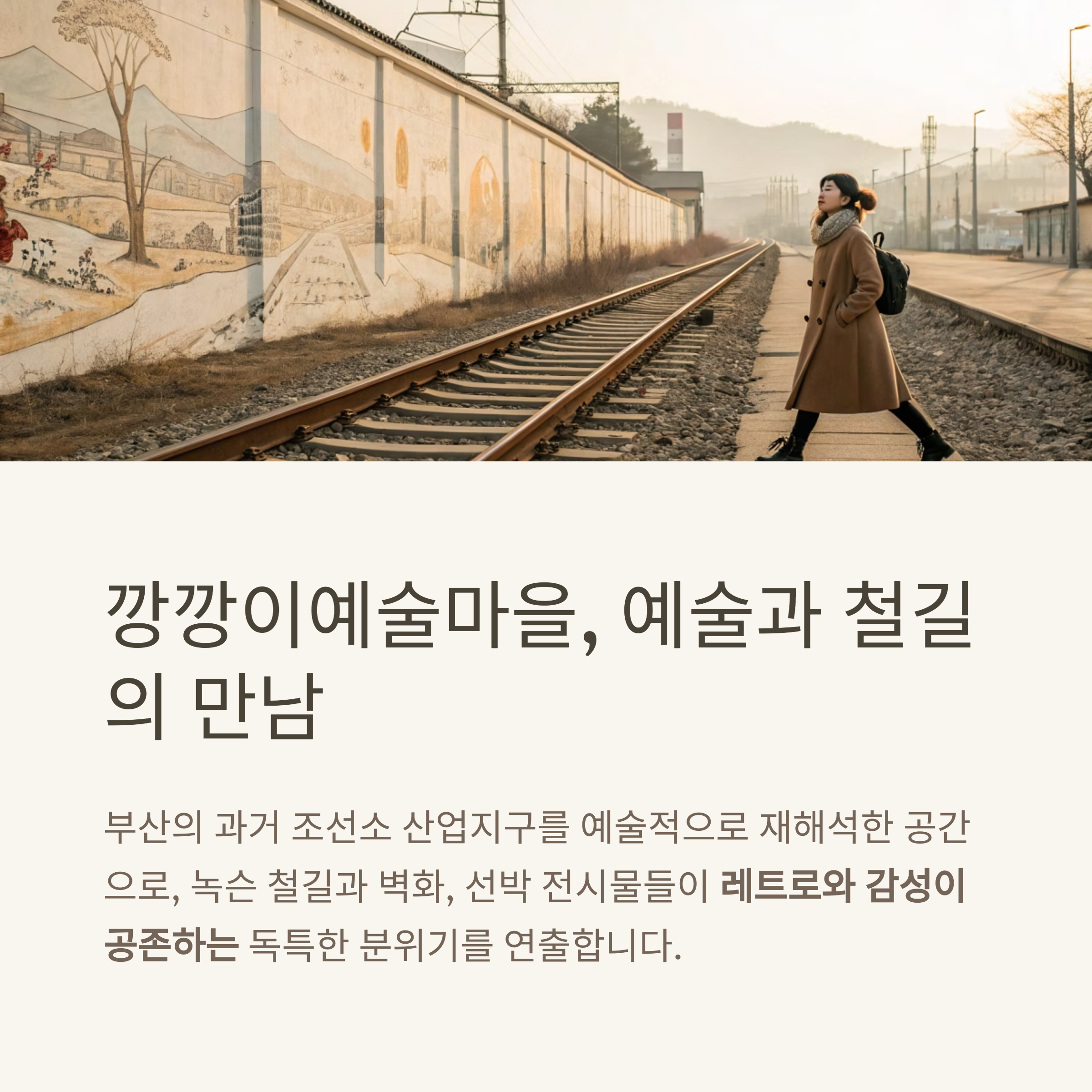 녹슨 철길과 벽화, 선박 전시물들이 감성적인 분위기를 연출합니다.