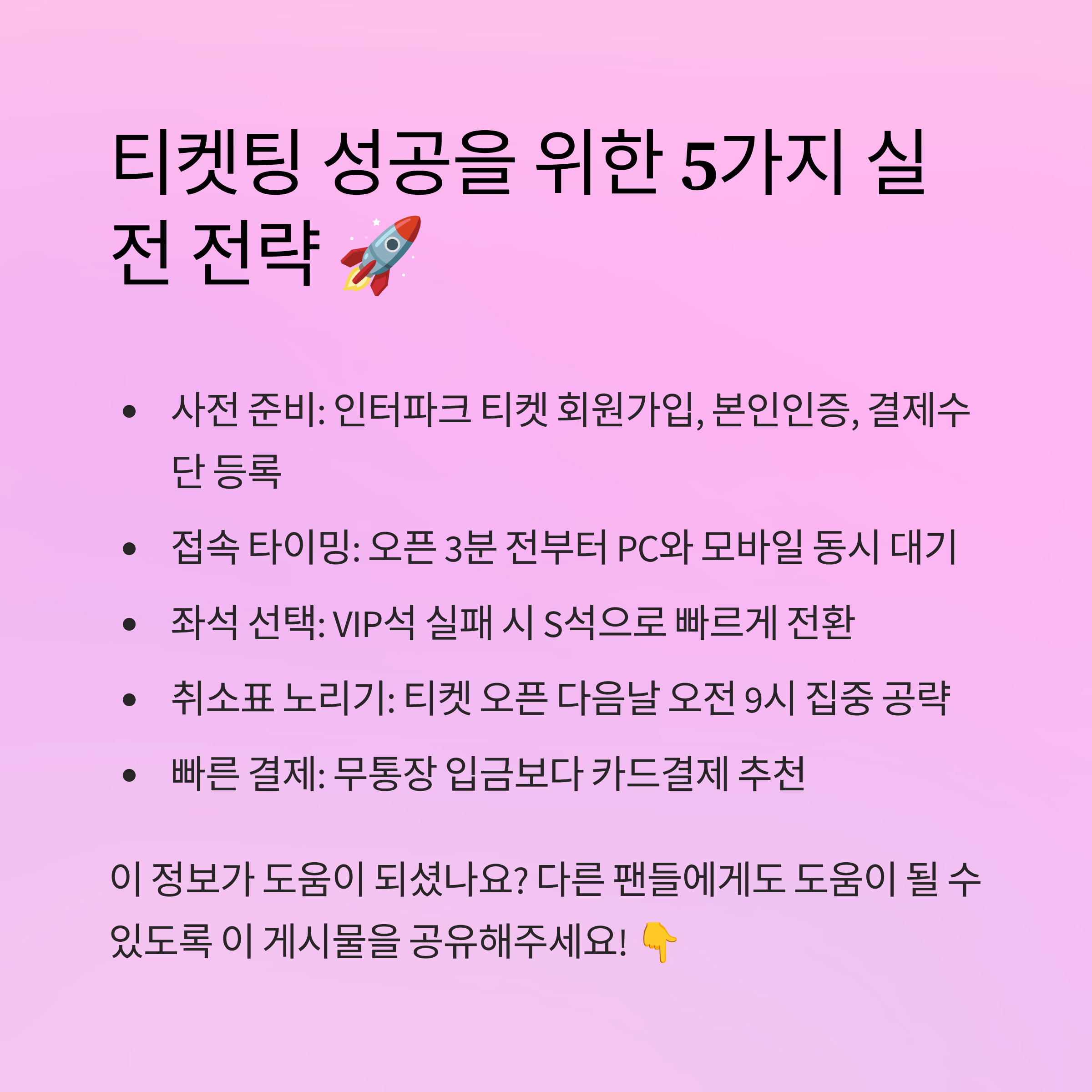 제가 직접 체감하고 주변 지인들에게 얻은 꿀팁들을 모아봤어요. 티켓팅은 정말 1초 싸움이잖아요. 이 다섯 가지 팁만 제대로 숙지해도 성공 확률이 확 올라갈 거예요!