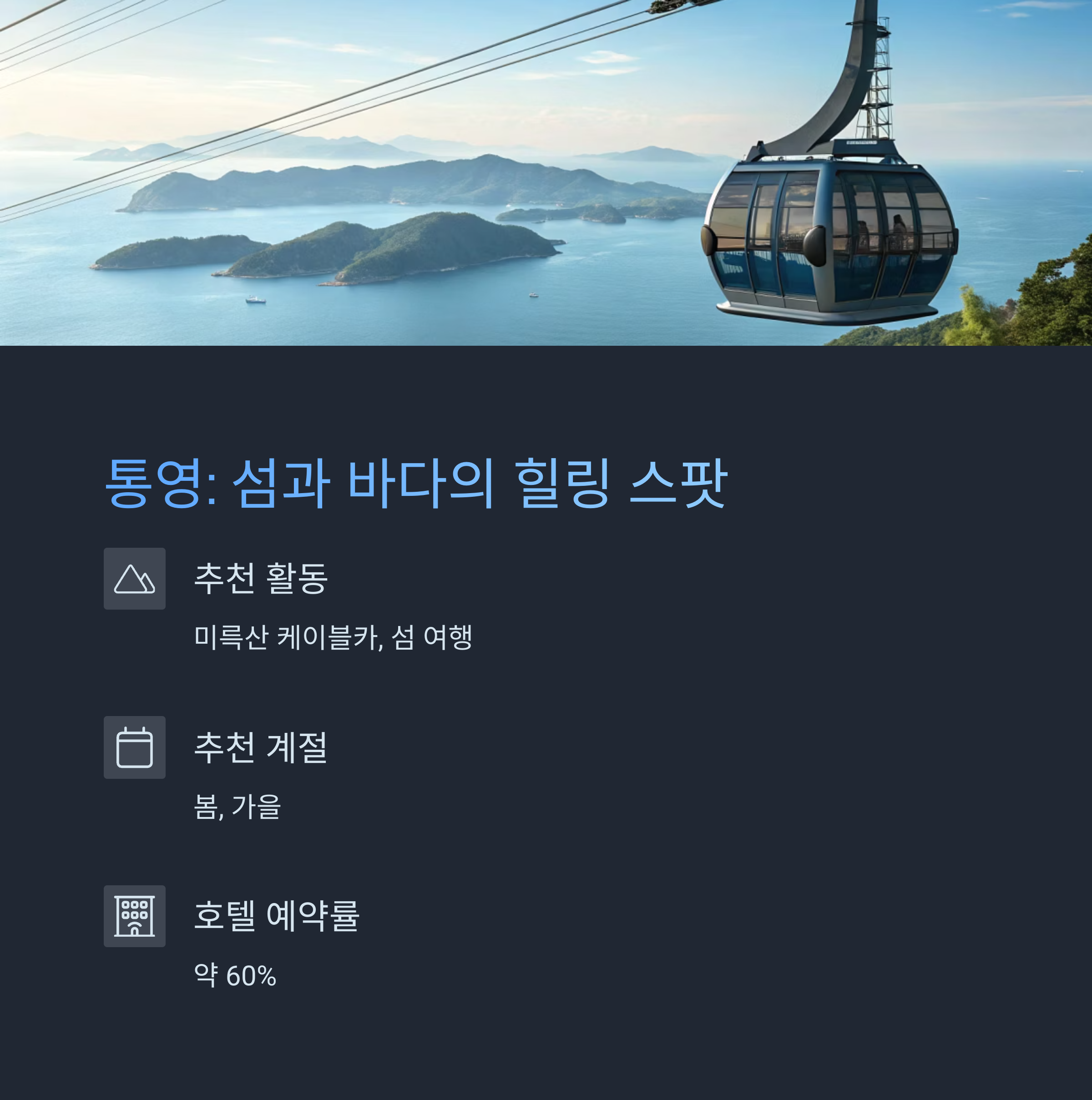 - 수치 정보: 통영 연간 방문객 수 약 200만 명 이상, 호텔 예약률 약 60%