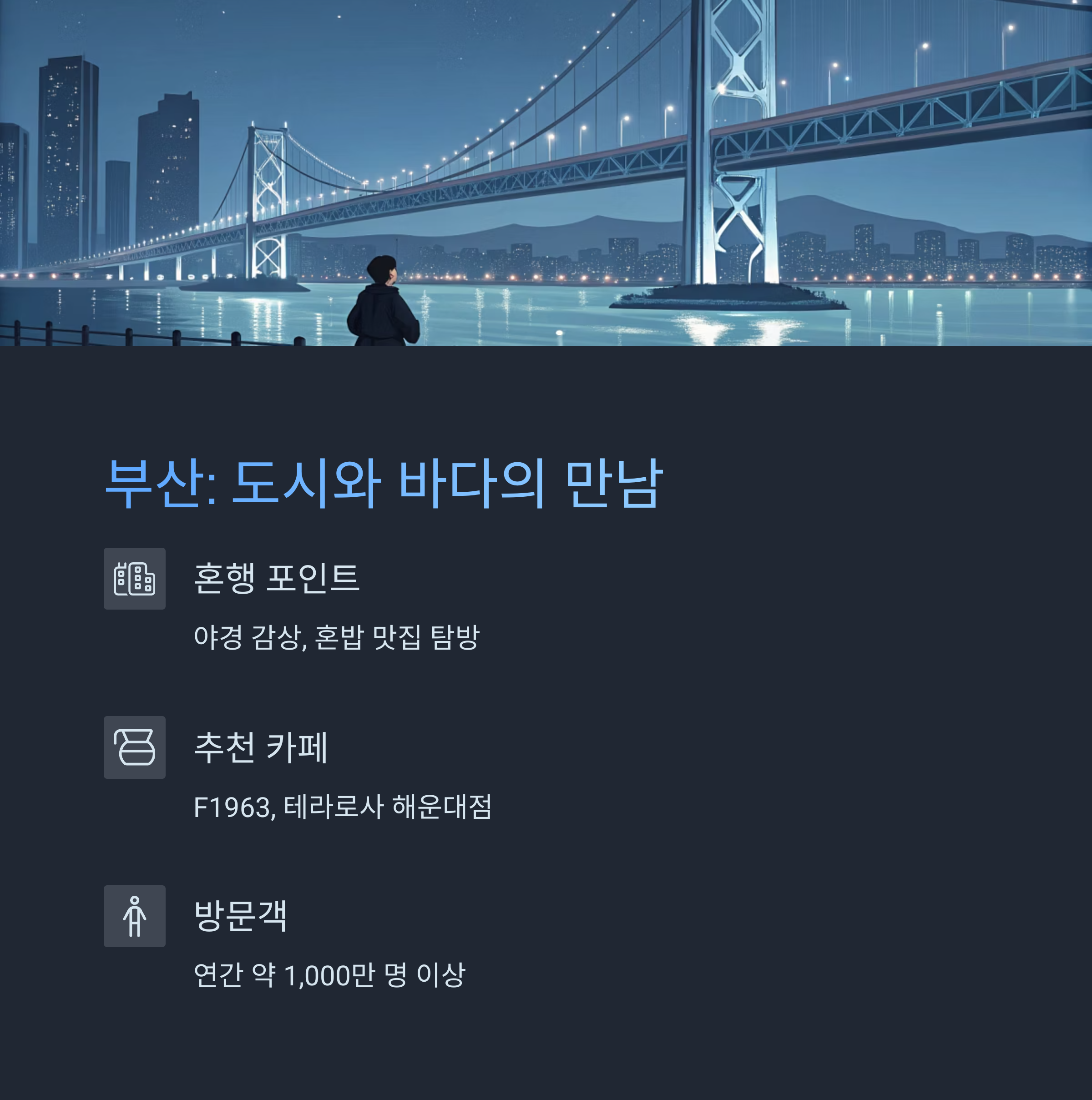 부산은 도시의 에너지와 바다의 여유를 동시에 느낄 수 있는 곳입니다.