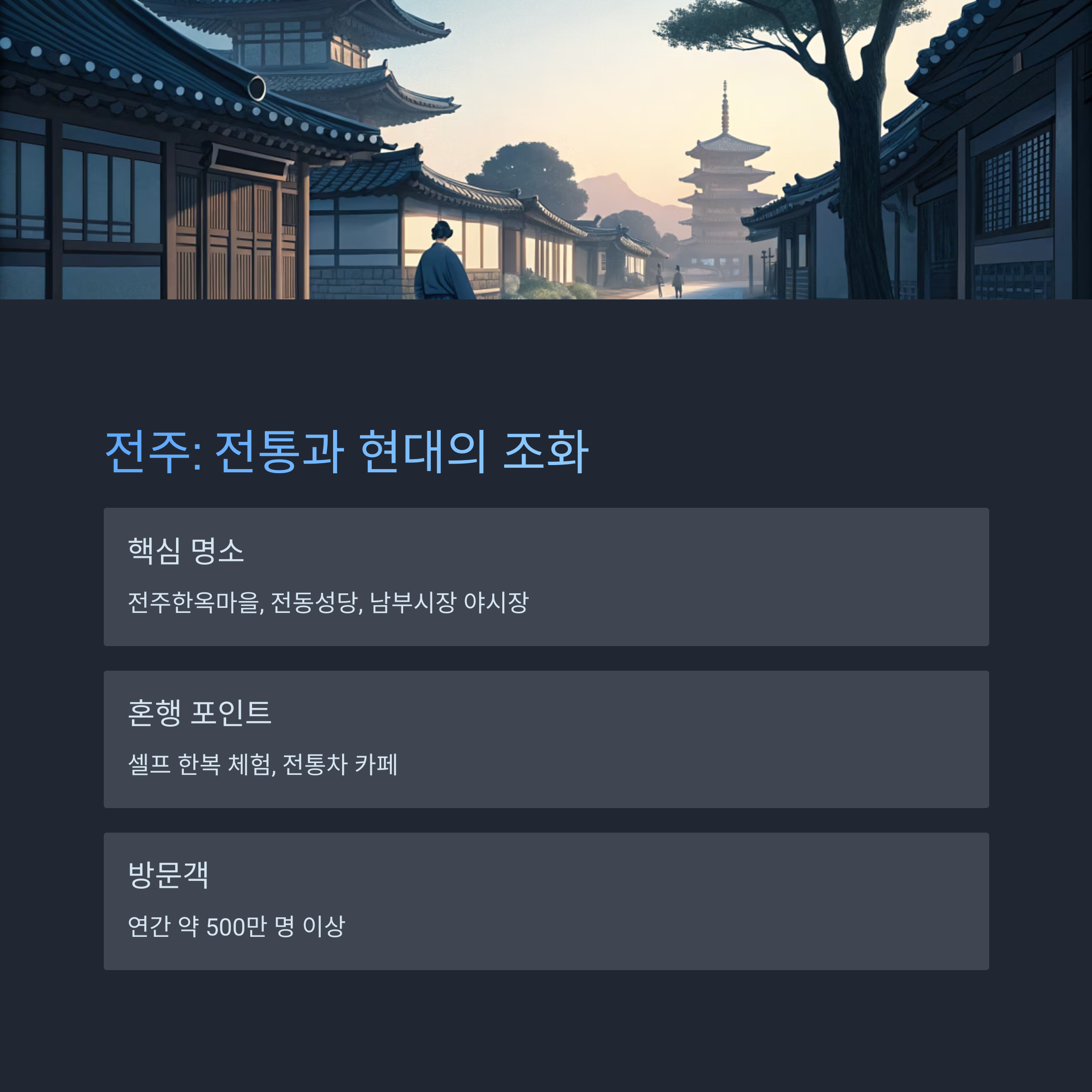 - 핵심 명소: 전주한옥마을, 전동성당, 남부시장 야시장