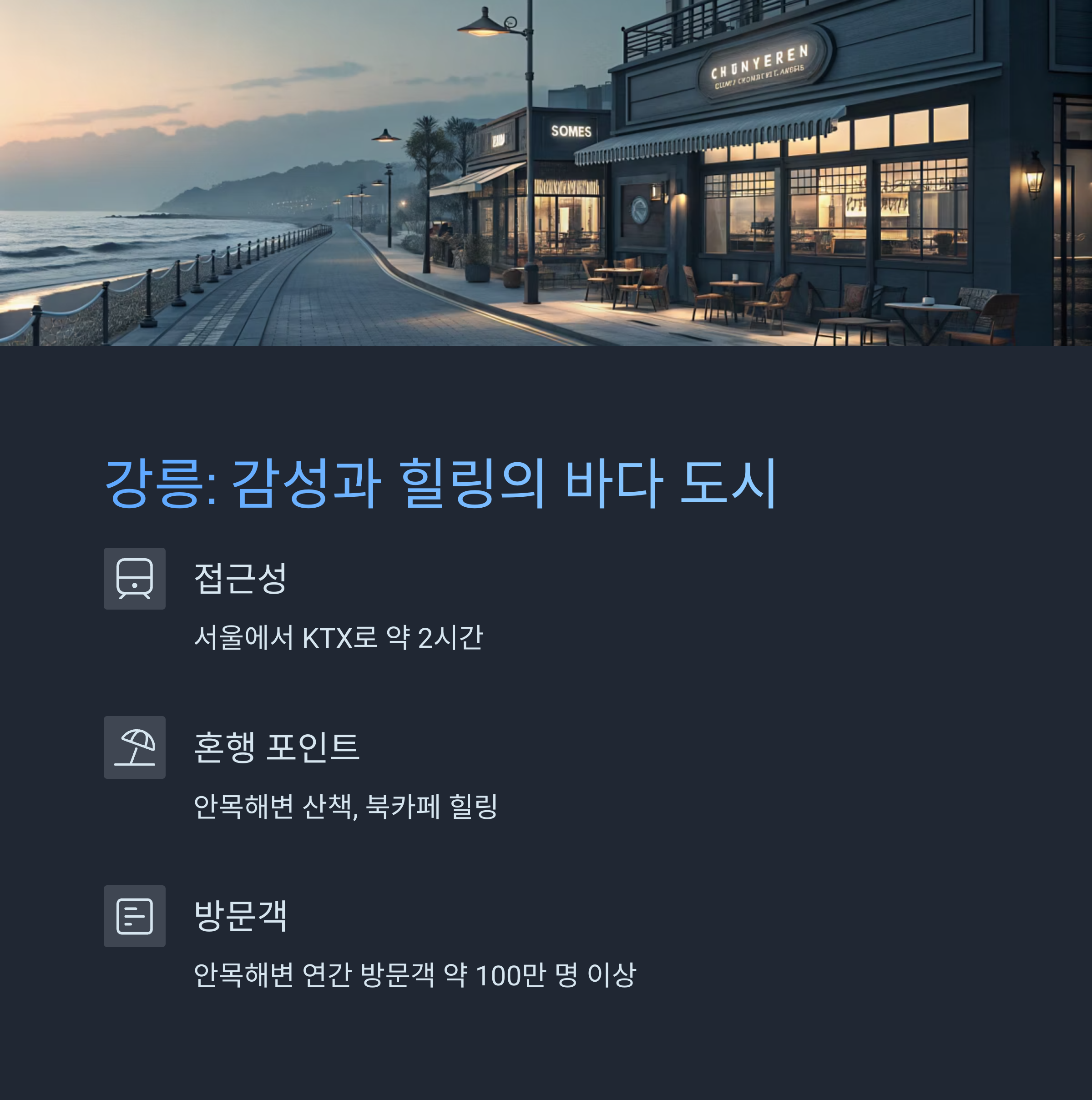 - 수치 정보: 안목해변 연간 방문객 수 약 100만 명 이상, 여름철 호텔 예약률 80% 이상