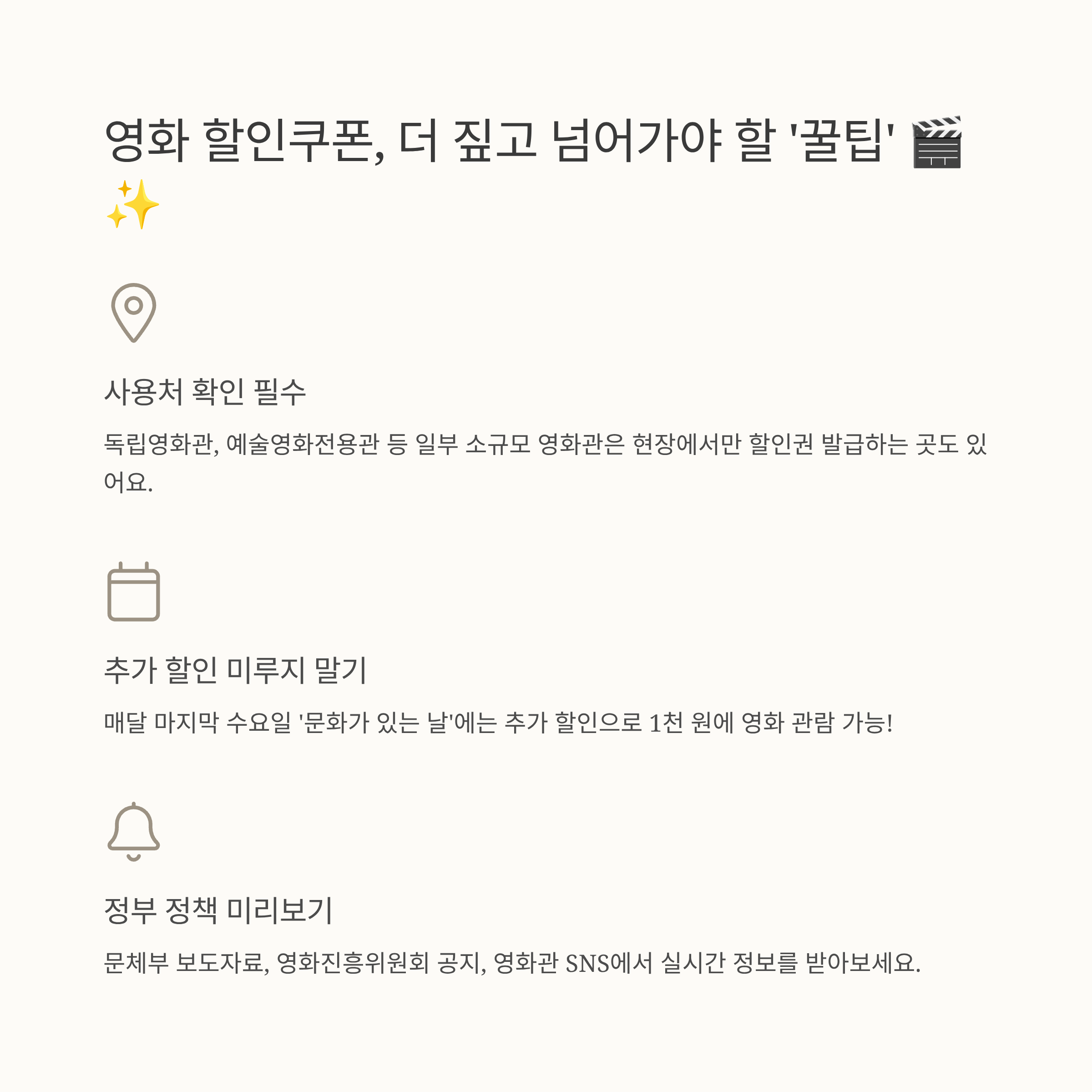 - 사용처 확인 필수: 독립영화관, 예술영화전용관, 실버영화관 등 일부 소규모 영화관은 현장에서만 할인권 발급을 하는 곳도 있으니, 방문 전에 꼭 전화로 문의하거나 공식 안내를 확인해야 해요.