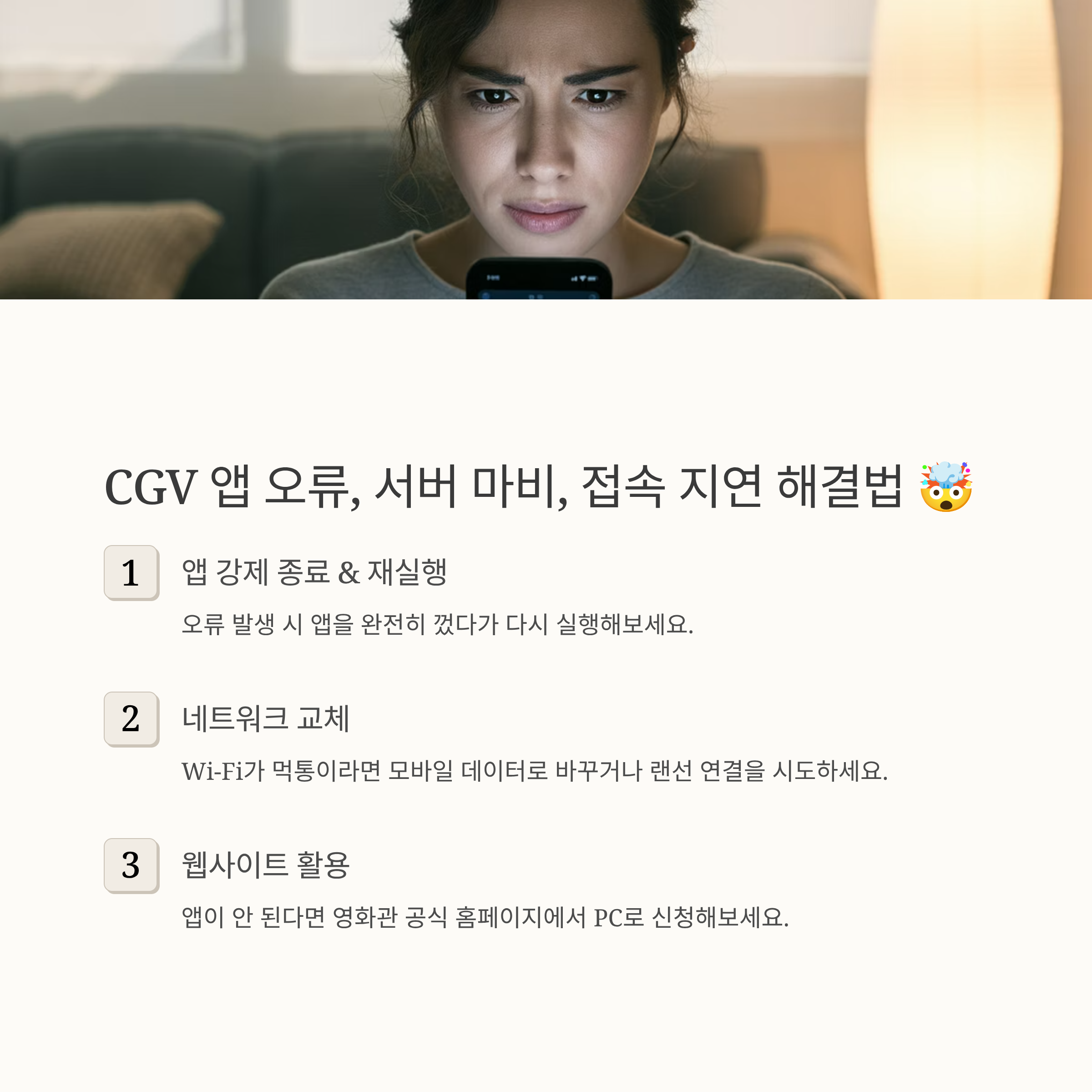 - 웹사이트 활용: 앱이 도저히 안 된다면, CGV 등 영화관 공식 홈페이지에 접속해서 PC로 신청해 보세요. 앱과 웹은 별개로 운영될 때가 많아서 웹에서 성공할 가능성이 높습니다.