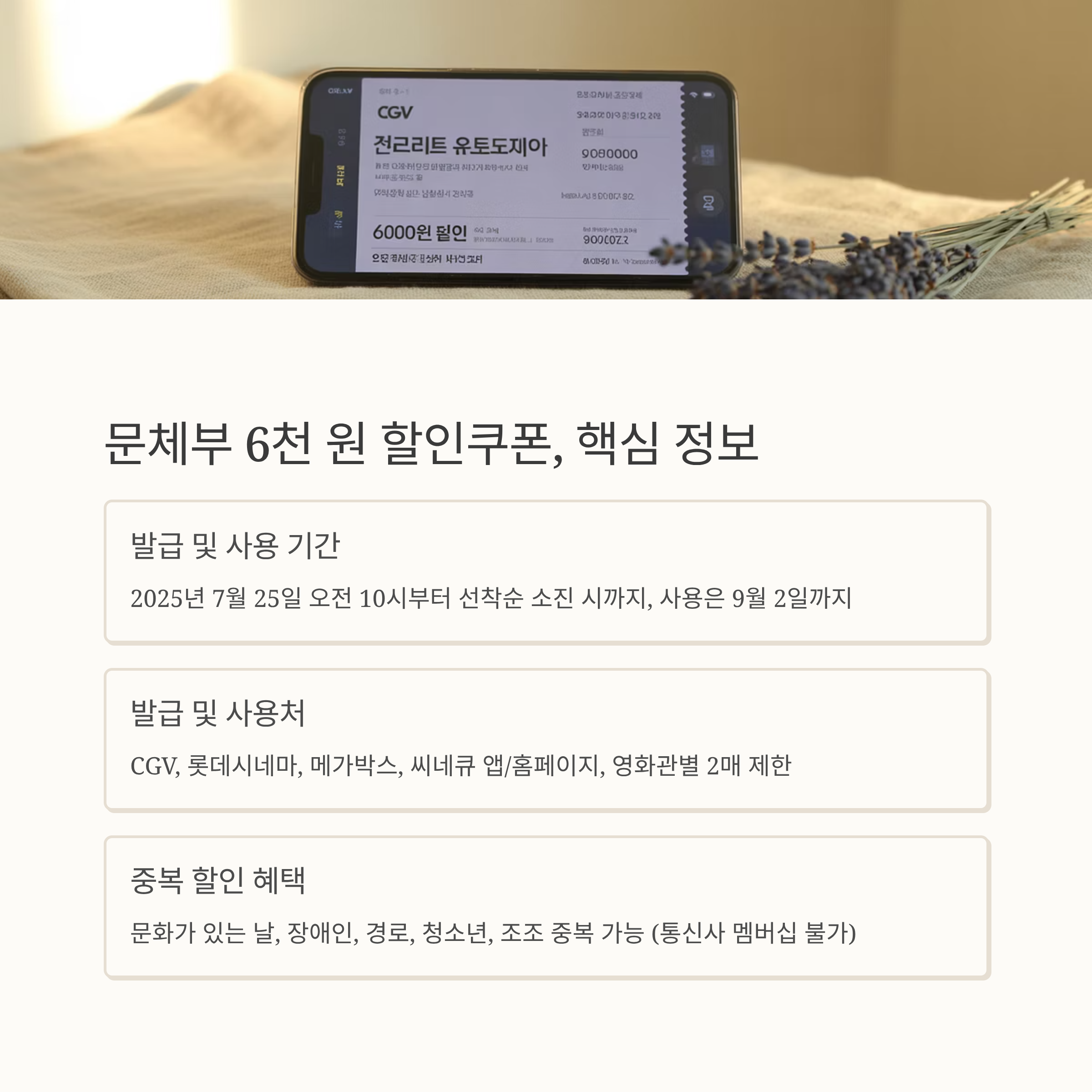 문화체육관광부(문체부)와 영화진흥위원회가 2025년 7월 25일 오전 10시부터 “영화관 입장권 6천 원 할인쿠폰” 450만 장을 무료 배포하기 시작했죠? 진짜 대박 사건입니다. 핵심 정보만 쏙쏙 뽑아 정리해드릴게요.
