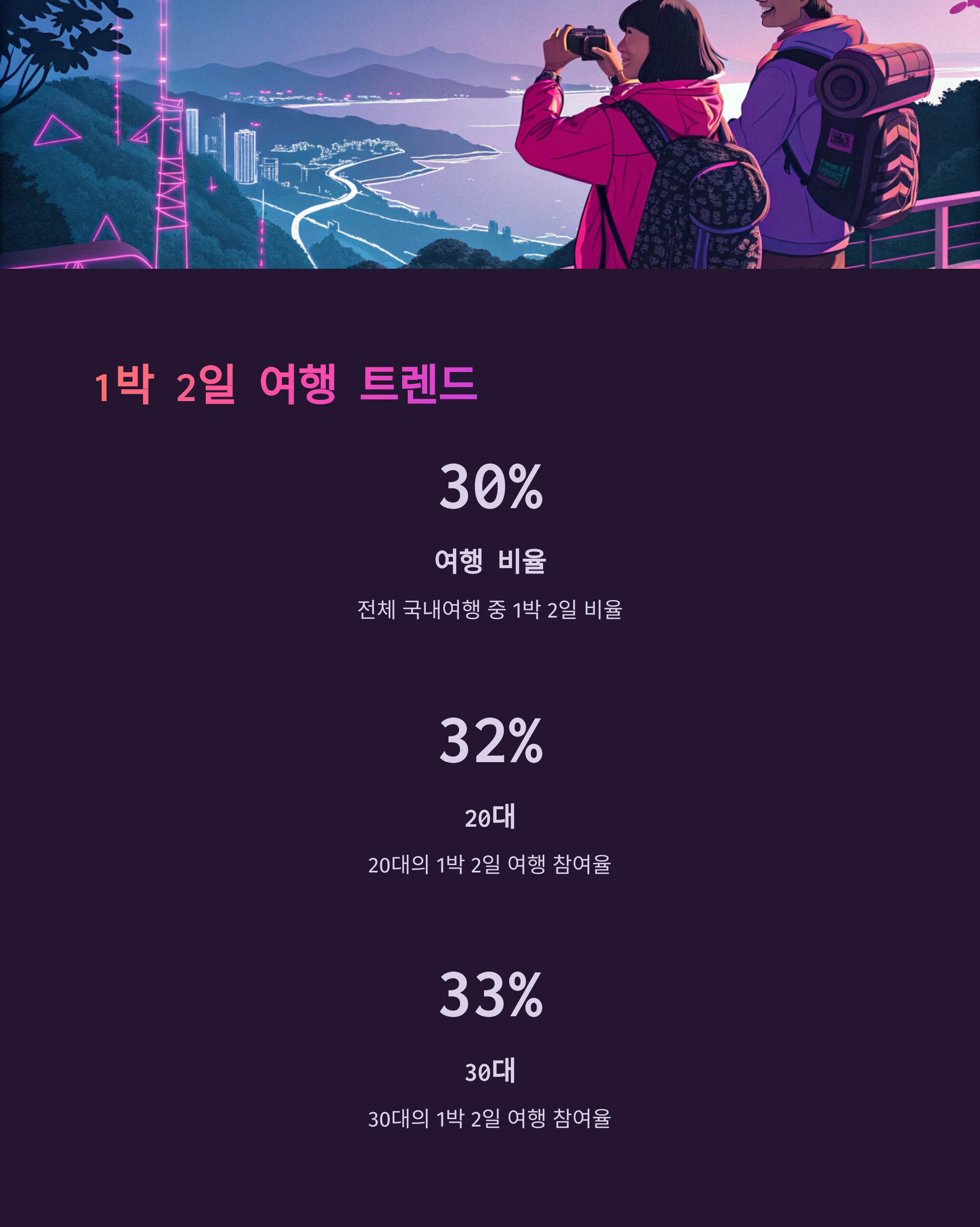- 여행 기간 통계: 전체 국내여행 중 1박 2일 비율 약 30%